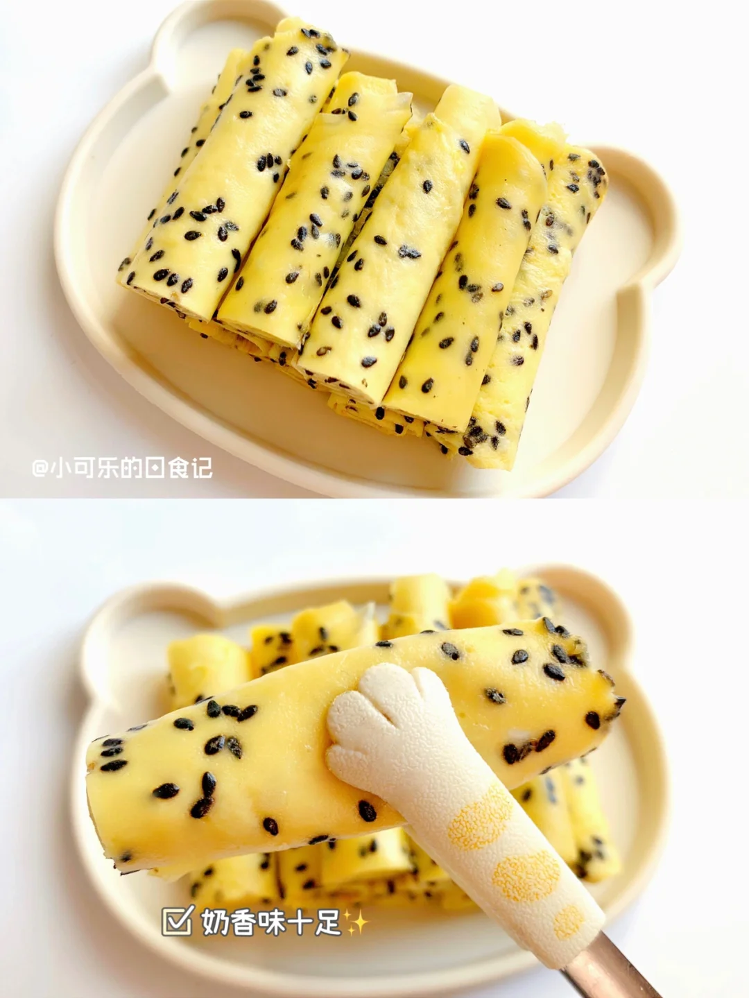 2⃣️锅里刷一层油,倒入适量面糊,表面凝固后,卷起来,切成合适宝宝拿的大小就可以啦