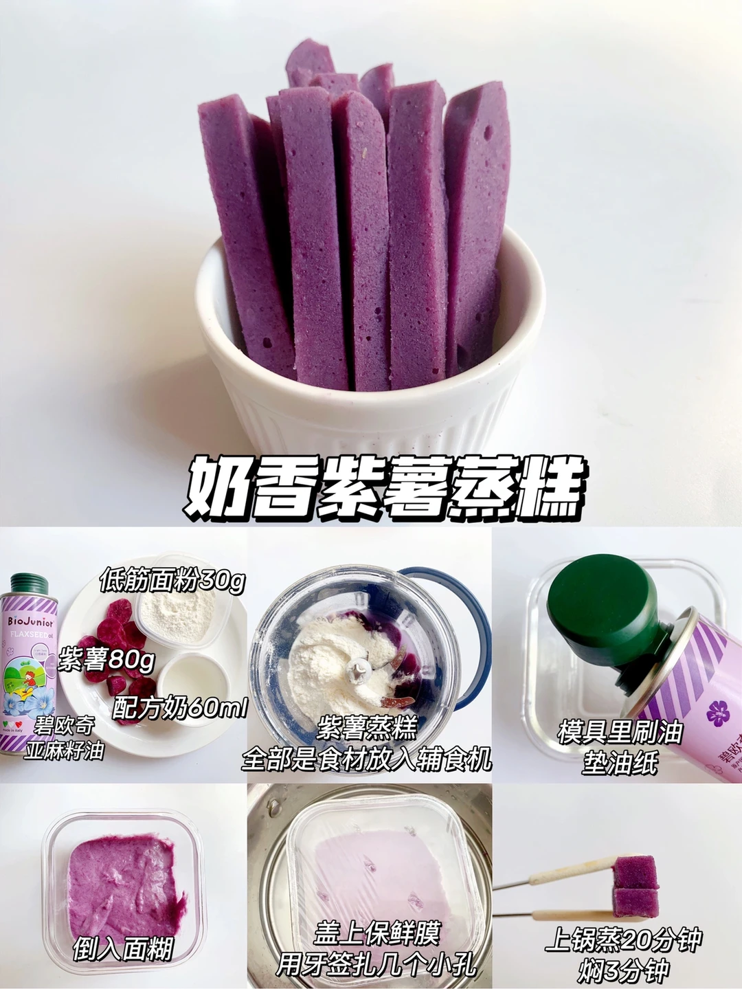 食材:紫薯80克、配方奶60毫升、低筋面粉30克、碧欧奇亚麻籽油