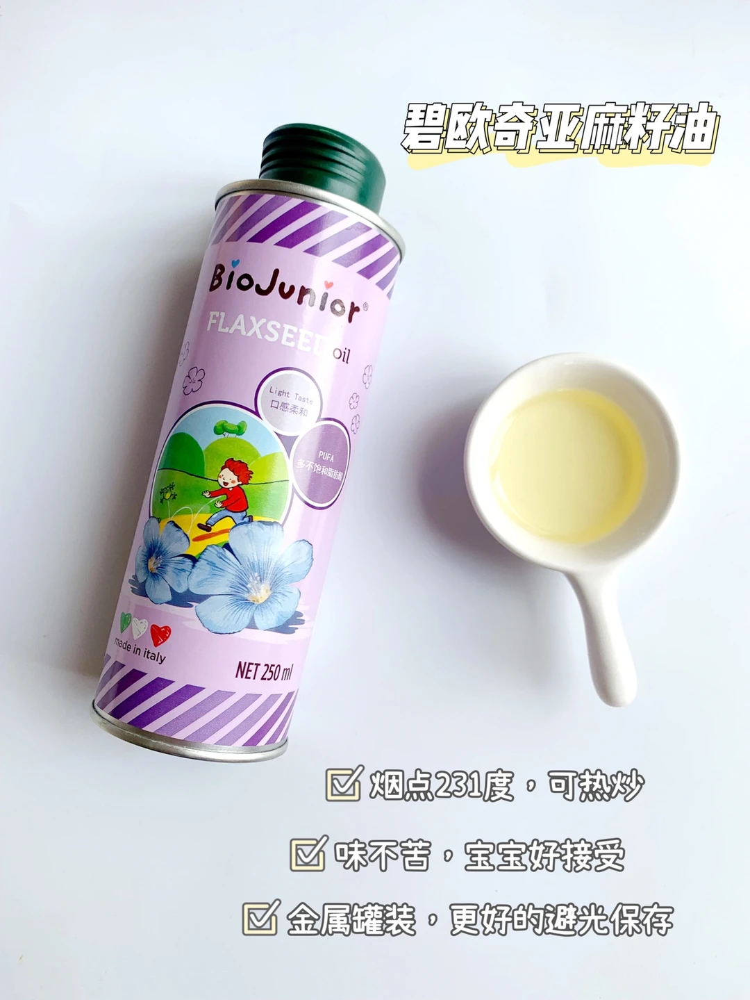 我用的是碧欧奇的亚麻籽油,他们家的亚麻籽油油脂纯,没有苦味,宝宝比较容易接受,烟点是231度,可以凉拌也可以热炒,金属罐装,更好的避光保存,添加辅食必备哦