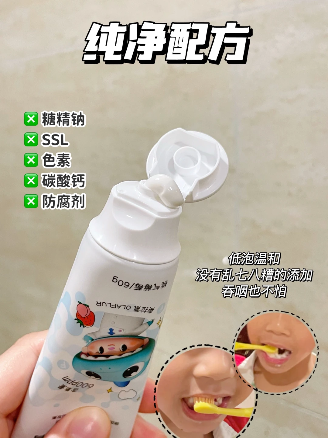 🔹我研究过成分,它是双氟配方,德国进口奥拉氟+氟化钠,能更好的包裹保护牙齿,配料表也很纯净,没有乱七八糟的糖精和色素添加,分段设计,小月龄用含氟量0.06%的,误吞了也不怕!