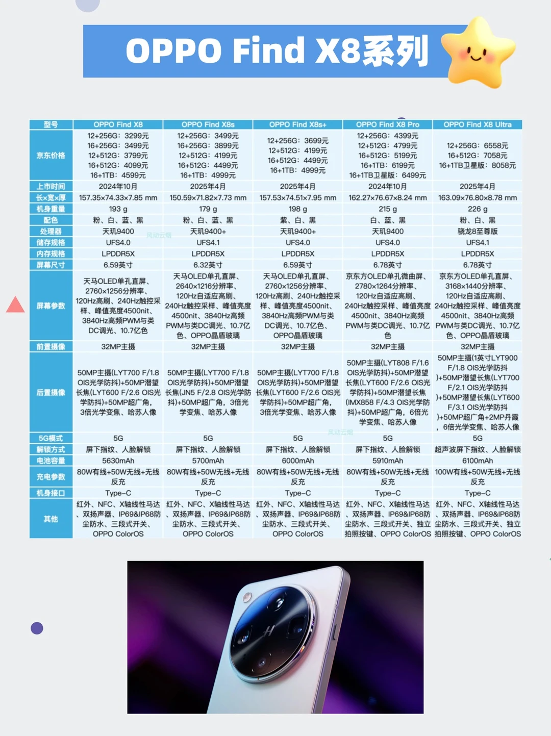 这次OPPO Find X8系列一共有5️⃣款,分别是:OPPO Find X8、X8s、X8s+、X8 Pro和X8 Ultra,国补后价格💰分别是3299元、3499元、3699元、4399元和6558元起步。
