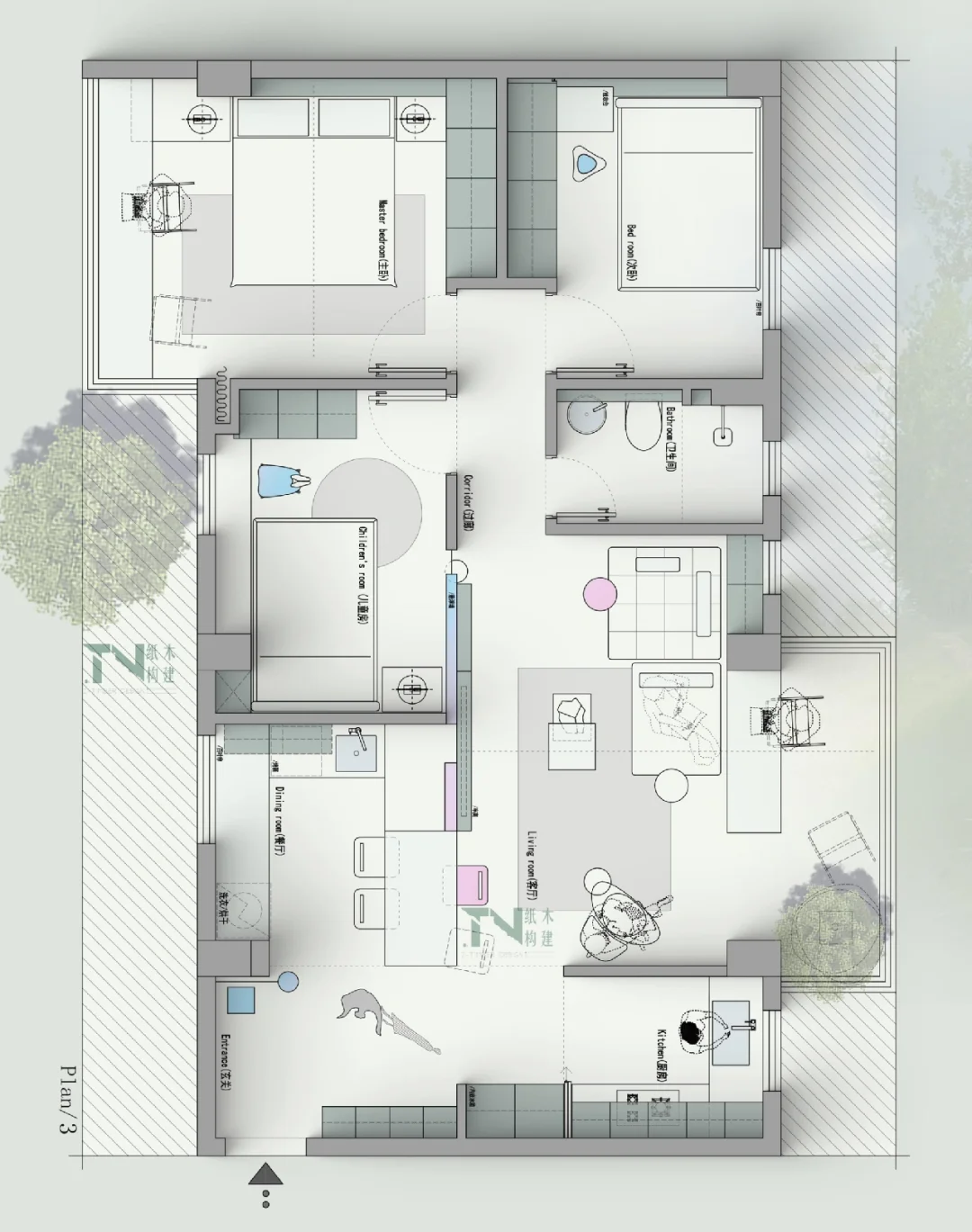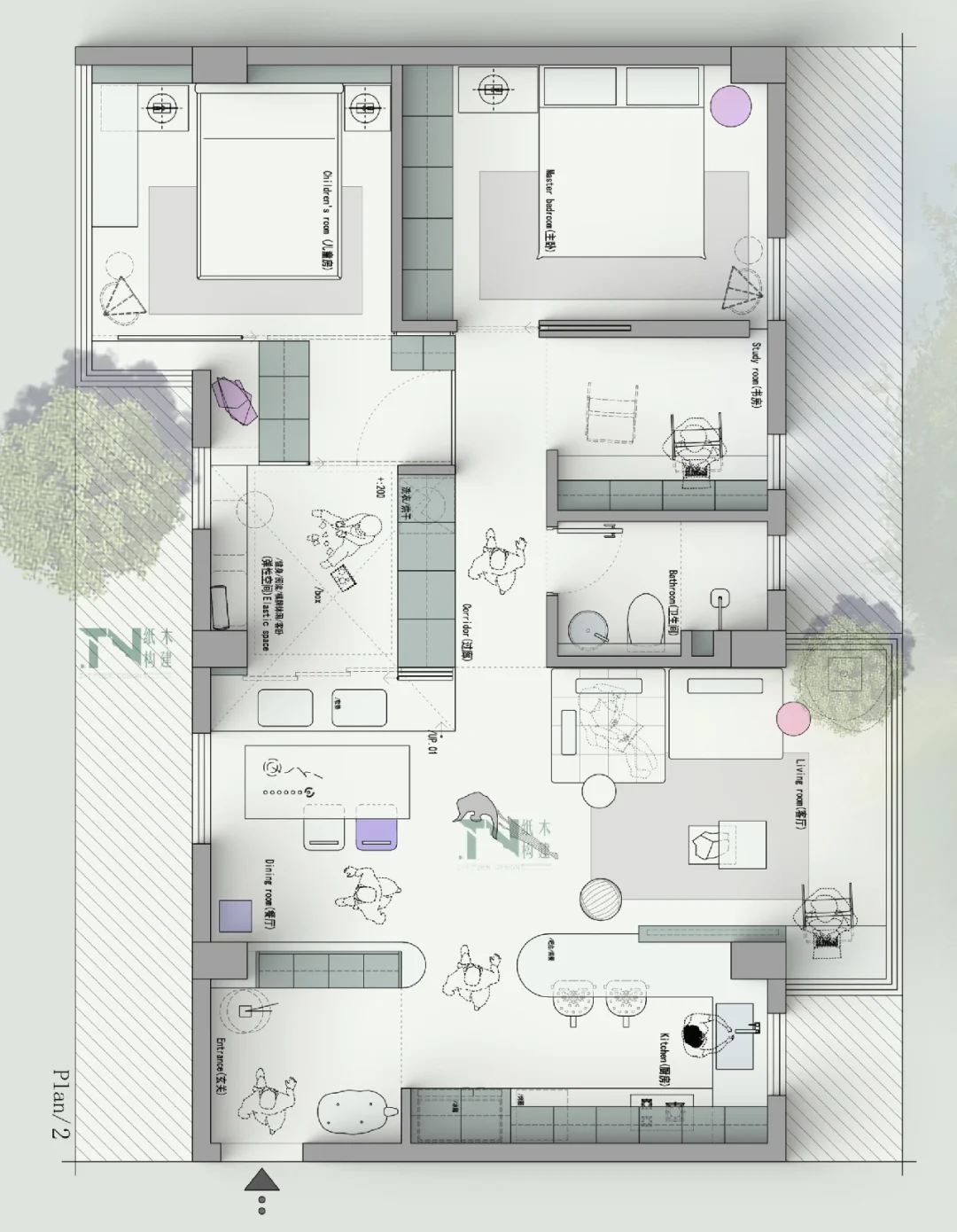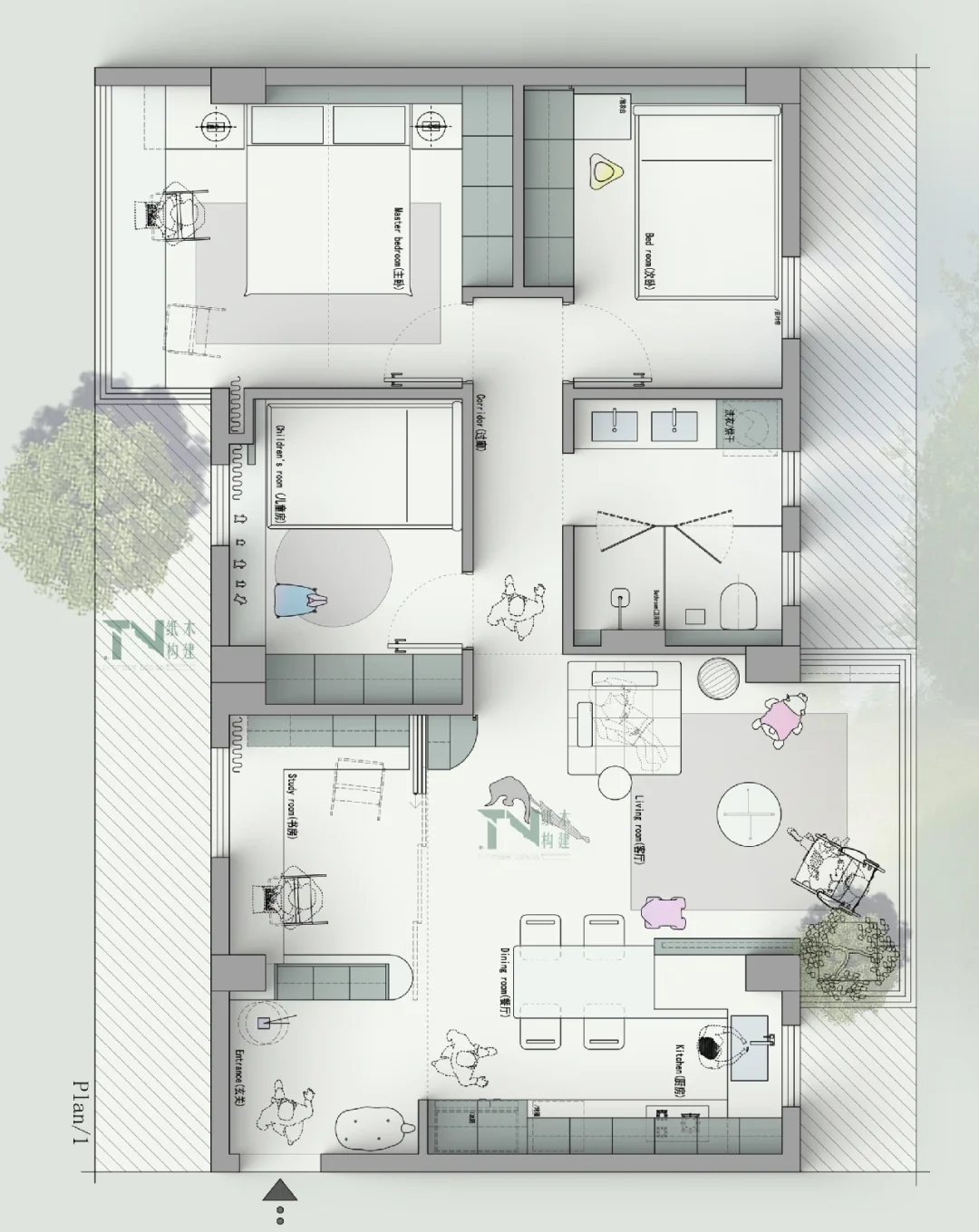 设计需求: 1、未来一家四楼 2、主卧,两个儿童房,书房 3、开放式厨房 4、趣味互动空间