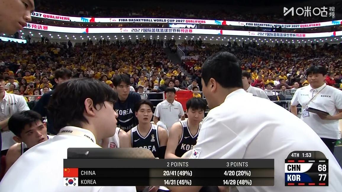 还有希望?!高诗岩三分命中,1分53秒还差9分中国男篮vs韩国男篮