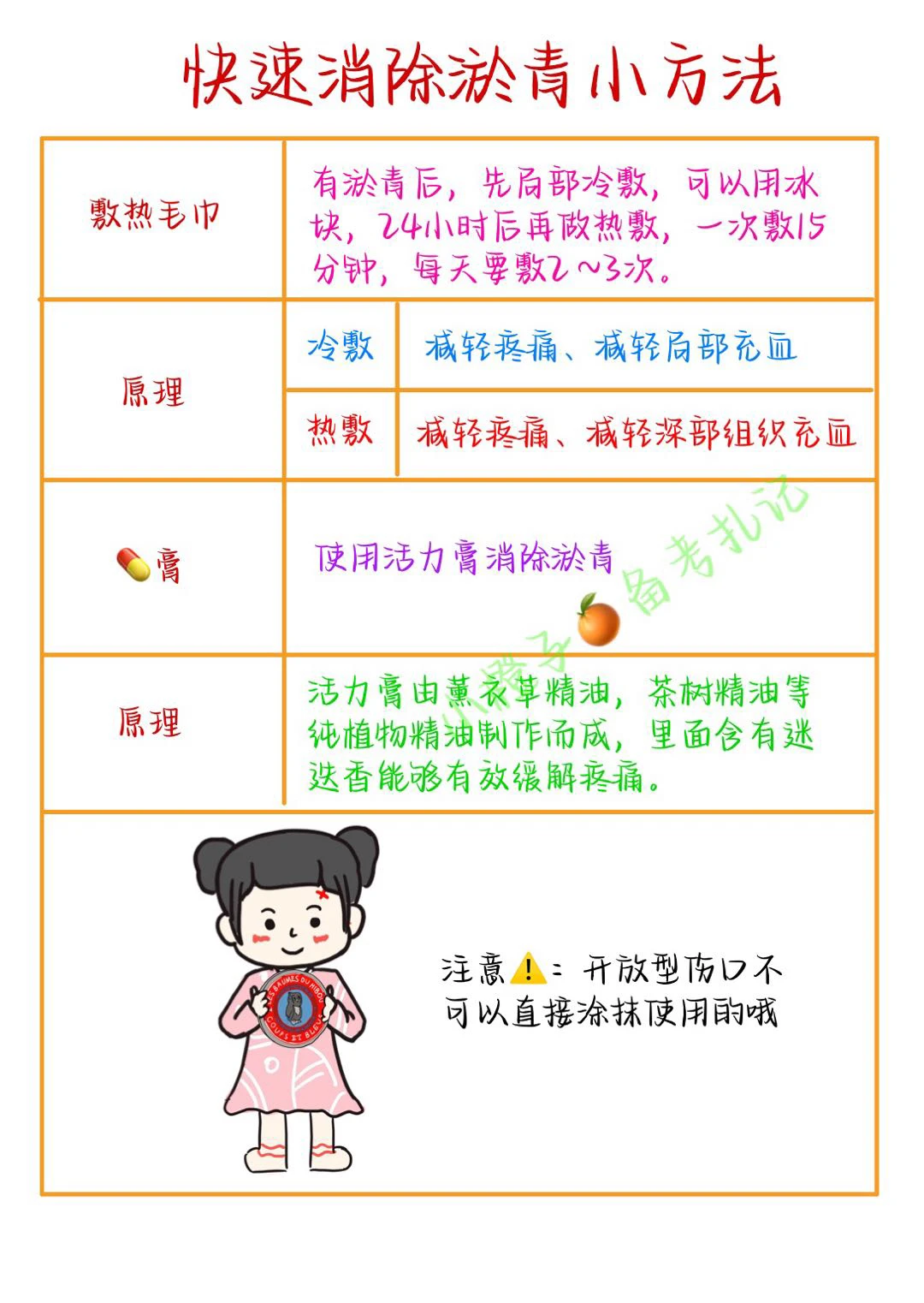 🍀敷毛巾:有淤青后,先局部冷敷,可以用冰块,24小时后再做热敷,一次性敷15分钟,每天要敷3~3次。