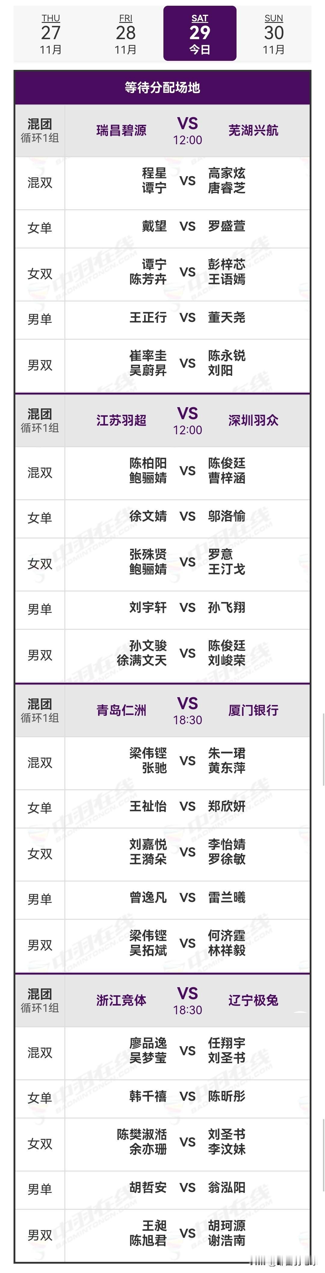 11月29日中国羽毛球俱乐部超级联赛安排 今天继续进行混团循环赛,白天场12:00开始,瑞昌碧源对阵芜湖兴航,江苏羽超对阵深圳羽众,晚场18:30开始,青岛仁洲对阵厦门银行,浙江竞体对阵辽宁极兔,详细对阵名单如下: 羽毛球 羽毛球爱好者 羽毛球比赛 羽毛球赛事 羽毛球赛程 国羽 国羽加油