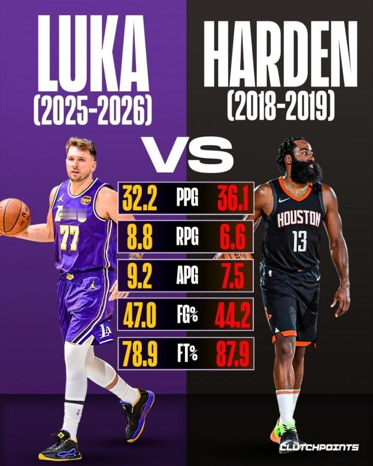 东契奇本季场均35.2分8.8板9.2助18-19哈登场均36.1分6.6板7