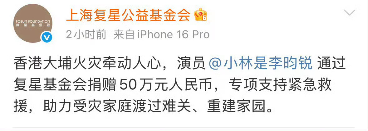 李一桐捐款50万元人民币支援香港大埔火灾救援
