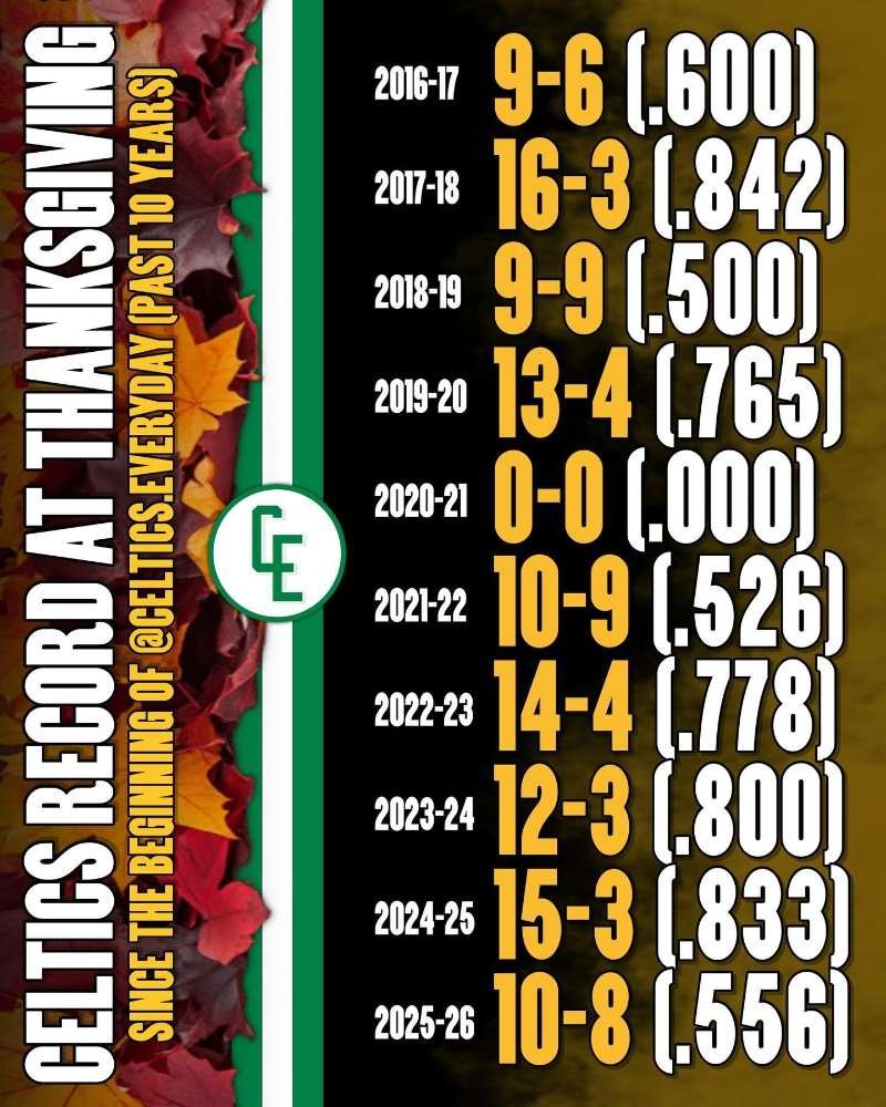 过去10年,感恩节假期前凯尔特人的战绩一览:这么看,今年的战绩真的还行凯尔特人热爱日记