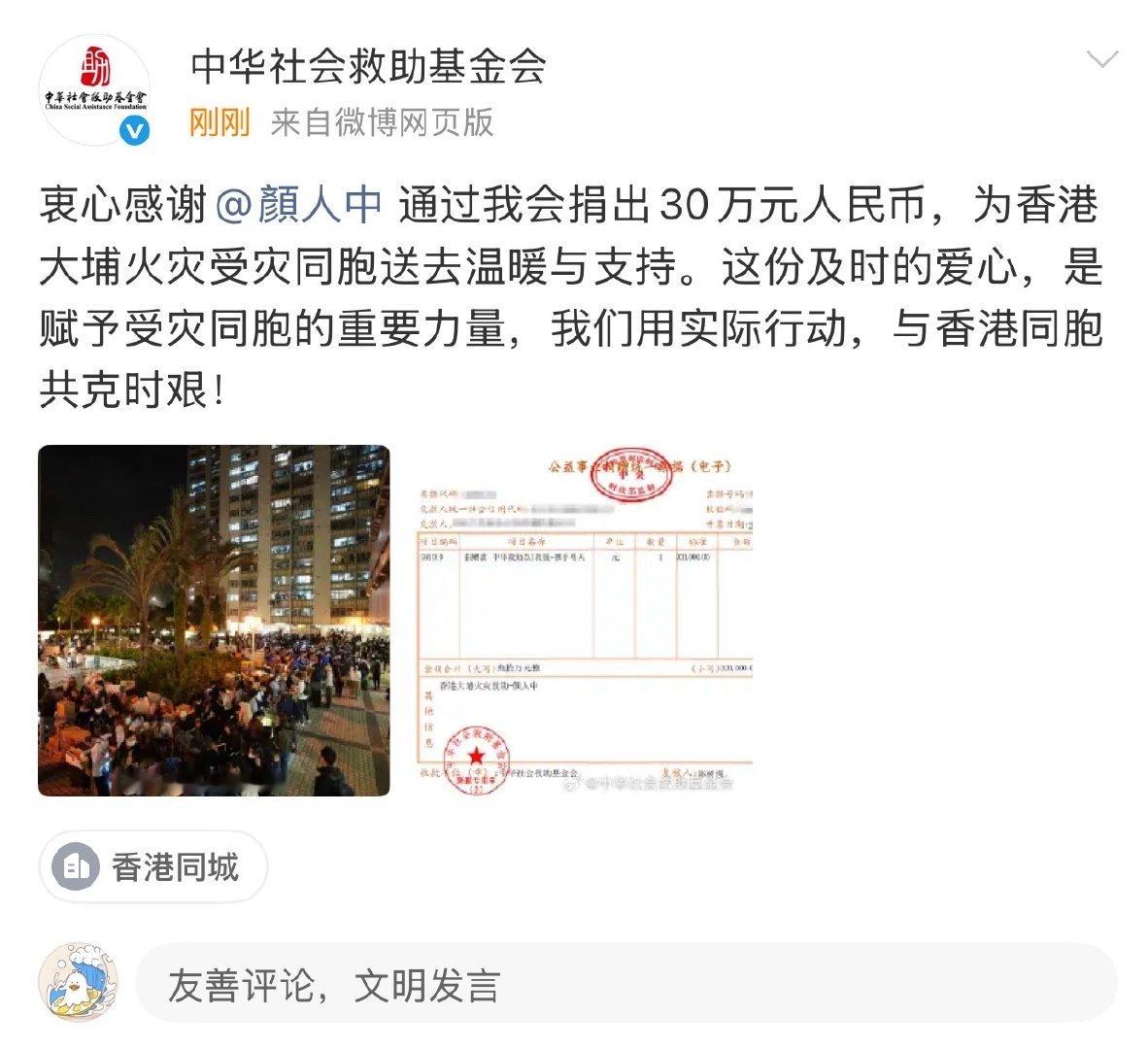 颜人中向香港捐款30万颜人中捐款30万元颜人中捐赠30万元用于灾情支援。深切哀悼遇难同胞,向一线消防人员致敬