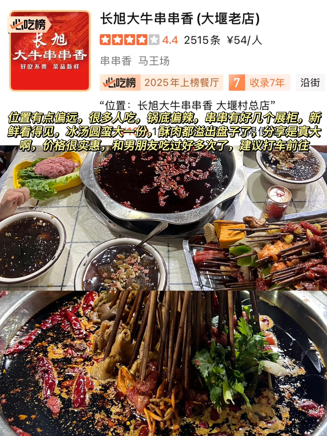 8.长旭大牛串串香:位置有点偏远,很多人吃,锅底偏辣,串串有好几个展柜,新鲜看得见,冰汤圆蛮大一份,酥肉都溢出盘子了,分享是真大啊,价格很实惠,和男朋友吃过好多次了,建议打车前往