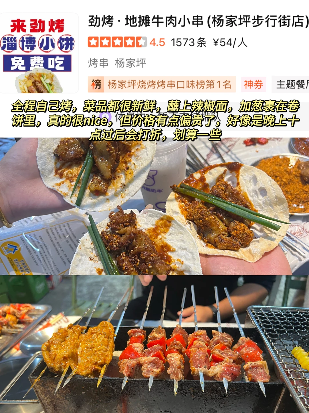 7.劲烤·地摊牛肉小串:全程自己烤,菜品都很新鲜,蘸上辣椒面,加葱裹在卷饼里,真的很nice,但价格有点偏贵了,好像是晚上十点过后会打折,划算一些