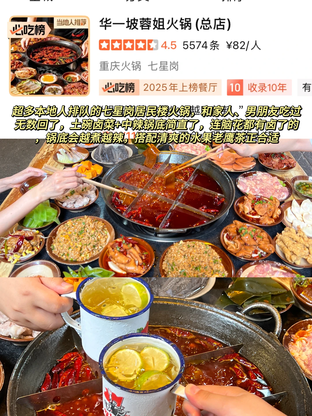 3.华一坡蓉姐火锅:超多本地人排队的七星岗居民楼火锅,和家人、男朋友吃过无数回了,土碗卤菜+中辣锅底简直了,连脑花都有卤了的,锅底会越煮越辣,搭配清爽的水果老鹰茶正合适