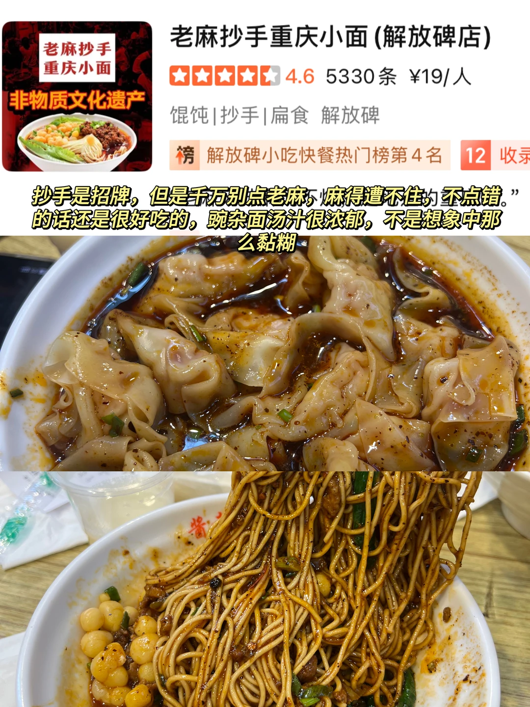 2.老麻抄手重庆小面:抄手是招牌,但是千万别点老麻,麻得遭不住,不点错的话还是很好吃的,豌杂面汤汁很浓郁,不是想象中那么黏糊
