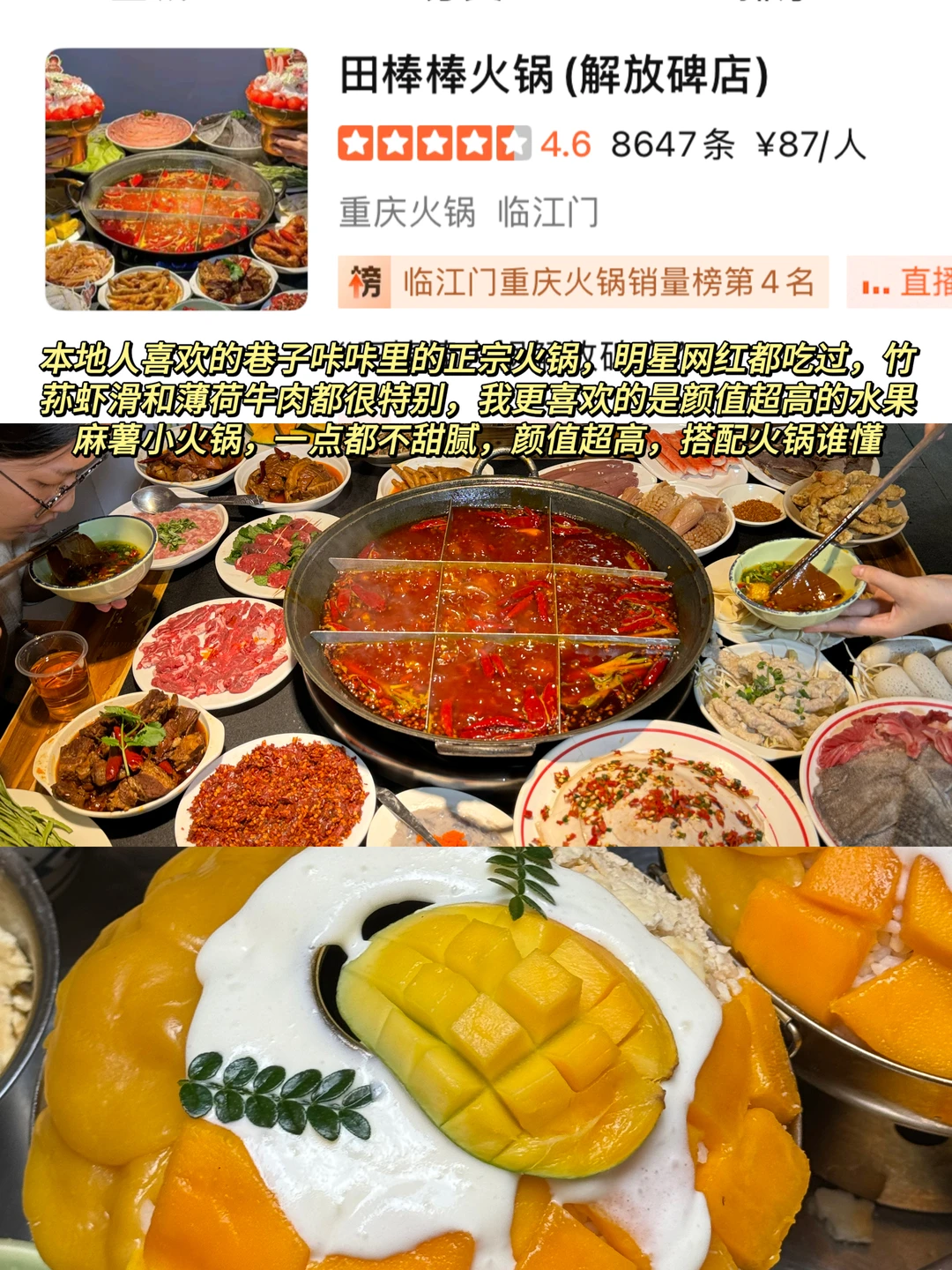 5.田棒棒火锅:本地人喜欢的巷子咔咔里的正宗火锅,明星网红都吃过,竹荪虾滑和薄荷牛肉都很特别,我更喜欢的是颜值超高的水果麻薯小火锅,一点都不甜腻,颜值超高,搭配火锅谁懂
