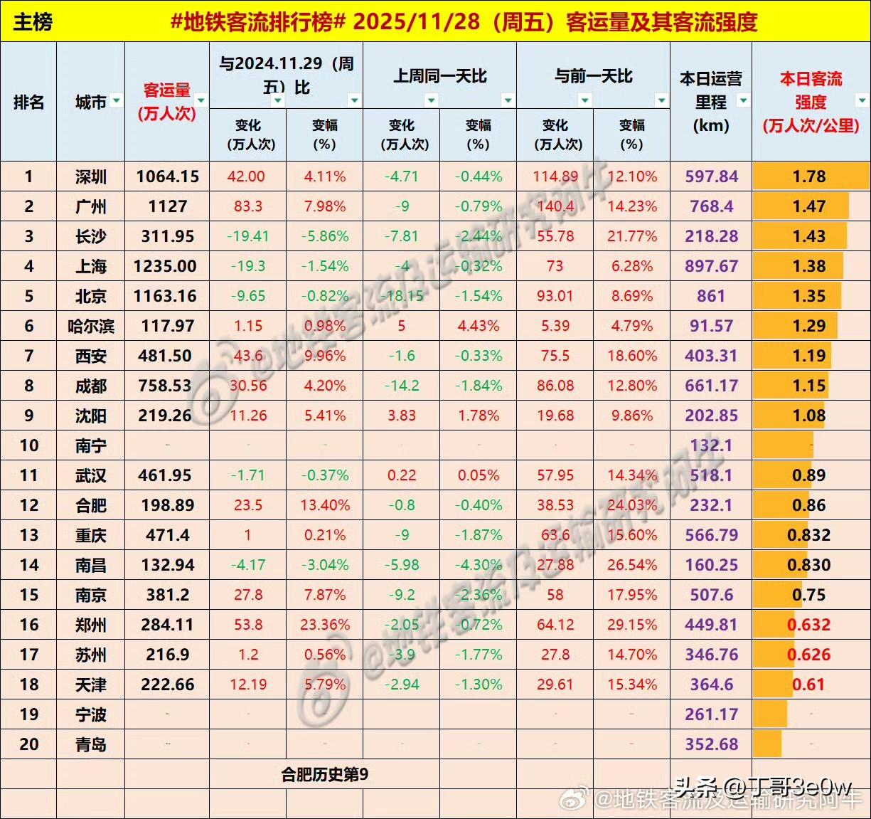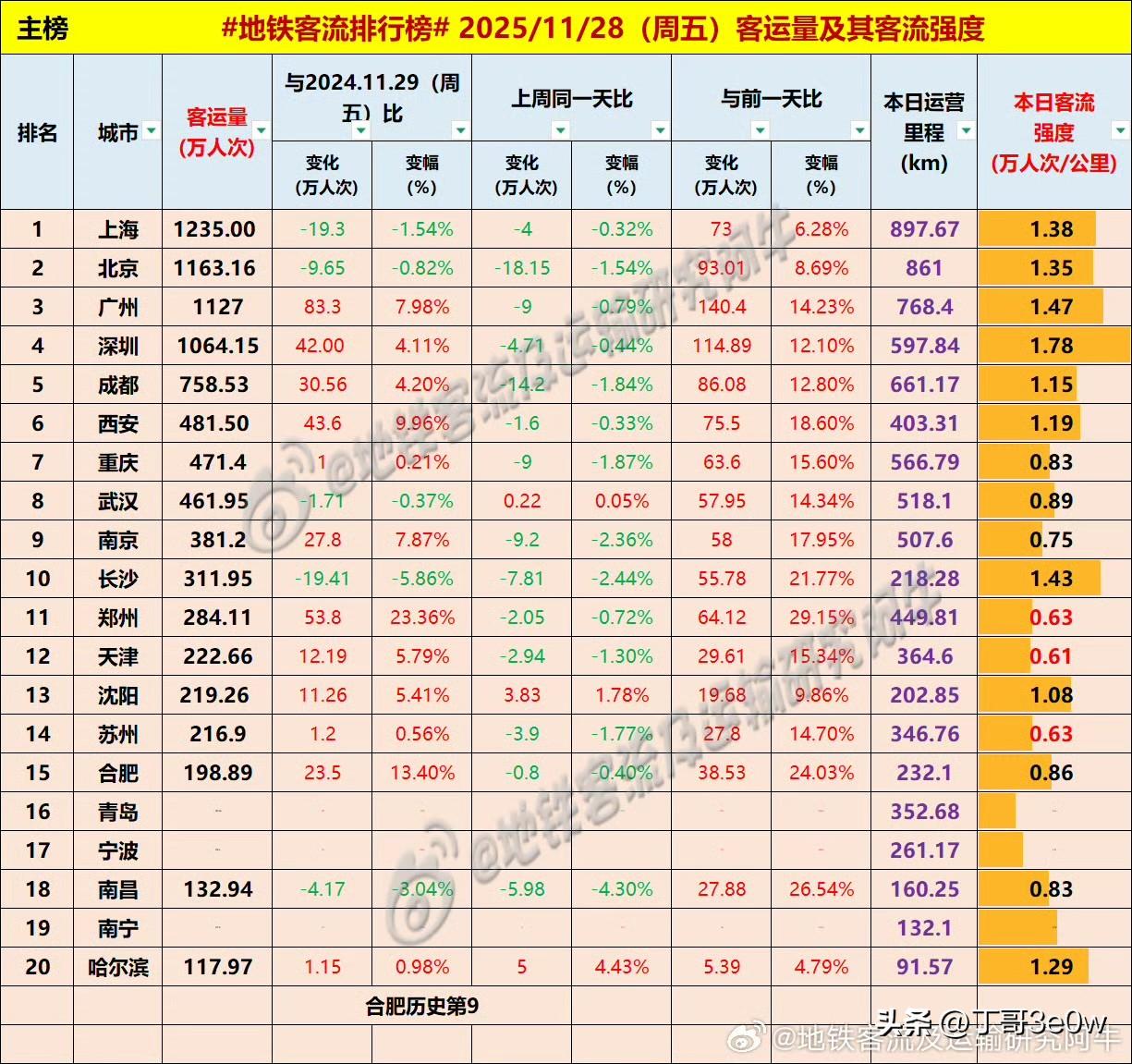 合肥地铁客流量周五接近200万人次,达199万多历史第九高[呲牙][呲牙][呲牙] 爆料 身边事 排行榜 周五 地铁客流排行榜 中国地铁客流日报 昨日客流 2025年11月28日 星期⑤ 全国重点城市轨道交通客流量排行榜: 上海:1235.00万 北京:1163.16万 广州:1127.00万广州地铁 深圳:1064.15万深圳地铁 成都:758.53万 西安:481.50万西安爆料 重庆:471.40万重庆身边事 武汉:461.95万武汉地铁 南京:381.20万 长沙:311.95万长沙爆料 郑州:284.11万郑州身边事 天津:222.66万天津地铁 沈阳:219.26万 苏州:216.90万苏州爆料 合肥:198.89万合肥爆料 青岛:130万+ 宁波:130万+宁波身边事 南昌:132.94万 南宁:110万+南宁爆料 哈尔滨117.97万