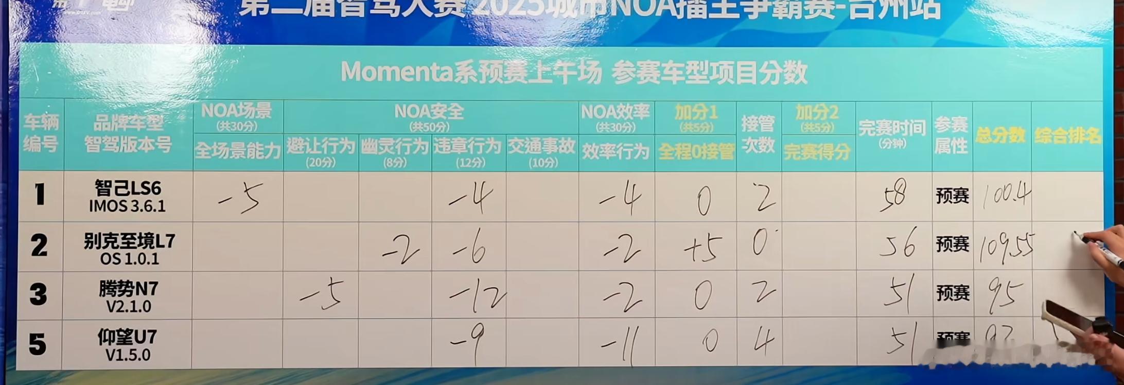 第二届中国智驾大赛 台州站预赛,星期六上午的MMT内战。别克至境L7凭借着全新的飞轮大模型R6版本,碾压其他三台MMT车型,而且拿下了零接管,这已经很久没有出现过了,明天的决赛将代表MMT出战决赛!只能说至境L7又一次证明了自己,上次的冠军也是实至名归了!赛后采访里别克L7的车主自己也说上次看到别克拿冠军都觉得这个比赛是不是有黑幕,结果自己参赛后发现这套辅助驾驶系统的上限比自己想象的高多了,真的拿到冠军了!大v聊车