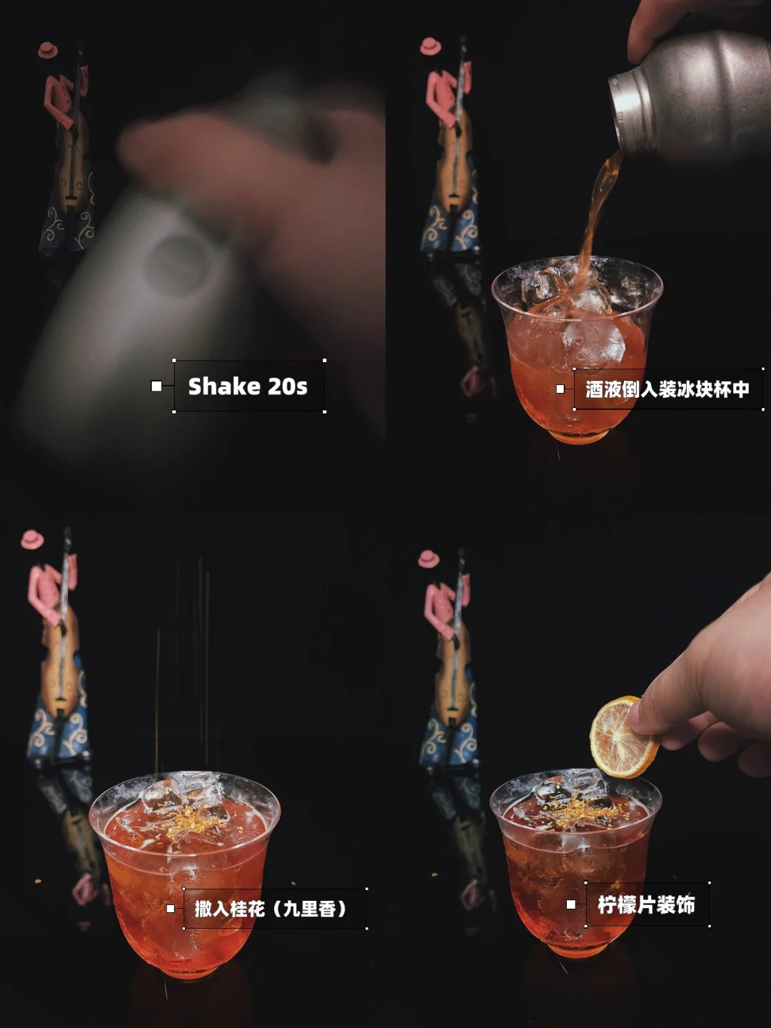 乌龙茶香气浓郁,入口甘甜,也是日常调酒非常喜欢加入的,每次酒香里带有乌龙茶香总能让我有一种“人生如茶,静心以对”的感觉[吧唧R],这次再有甜味美思与金巴利的味道,犹如顿时把人拉回“人生甜苦”跨越体验[捂脸R],后感伴随的桂花(别名九里香)的一味恼人香,更使如“应是良辰好景虚设。便纵有千种风情,更与何人说”的情境,细品后 袭人心怀,沁人肺腑。又在芳香中带有一丝甜意,使人久闻不厌,多了份酸楚,多了份惊喜[叹气R]。