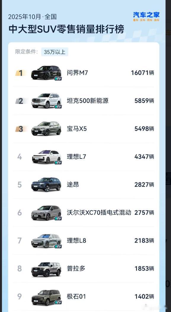 中大型SUV零售销量,理想L7/8/9全部大幅环比下降。极石01现在进入到榜单了,以前记得极石01就是对标理想L8,号称理想L8的越野加强版。当时还被人嘲笑,现在竟然看到极石01有可能反超理想L8的可能了。