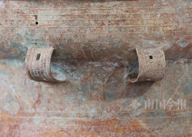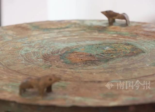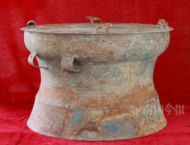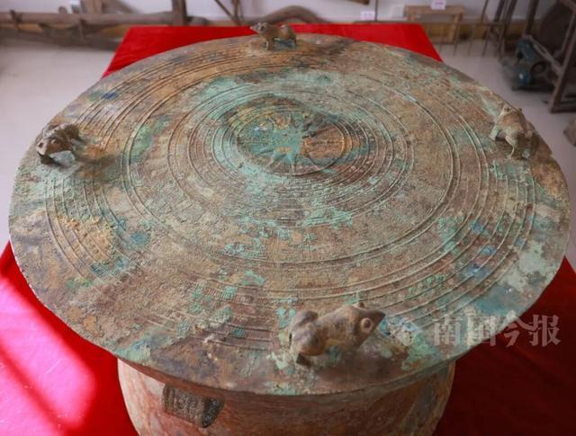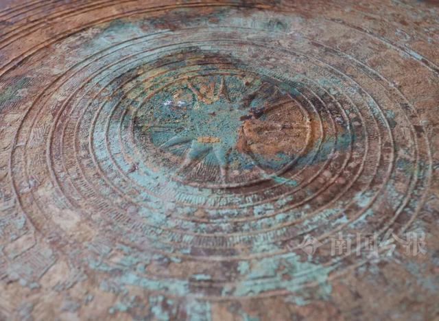 【柳州钓鱼佬挖出千年前铜鼓 或为汉代至南北朝时期】近日,在柳州市柳城县大埔镇南村河背屯小河边的竹林里,村民在挖钓鱼用的蚯蚓,挖出一个上千年的铜鼓,且完好无损。鼓面直径69厘米,重达59斤,中心有太阳纹,鼓边铸4只青蛙。目前,柳城县已上报自治区进行详细鉴定。挖鱼饵挖出千年铜鼓在河背屯小河边的竹林里,留有一堆新挖的黄土,这就是铜鼓重现的地方。11月20日,村民杨建球为了挖钓鱼用的蚯蚓,突然挖到一个坚硬的物品,继续挖发现,竟是一面铜鼓。随后,他上报了有关部门。“我车烂了不要紧,我怕文物伤了……”11月23日,柳城县博物馆馆长廖桂引等来到该屯,将铜鼓运回馆中,并给村民颁发了证书。当地村民回忆说,上世纪60年代,曾有人在此挖土夯墙建房,当时挖土深达两三米,可惜,与这面铜鼓失之交臂。半个多世纪过去,这个宝贝最终与大家见面。有太阳纹还有4只青蛙柳城发现的这面铜鼓,鼓面直径69厘米,高44厘米,重达59斤。铜鼓无底腹空,腰曲胸鼓,造型有力、庄重耐看,给人以稳重饱满之感。鼓面为重点装饰部分,中心配以太阳纹,外围则以18个晕圈装饰,与鼓边接近的圈带上铸着4只精美的青蛙,各位于东、西、南、北方向。铜腰对称两侧各有一对鼓耳。鼓胸、鼓腰也配有许多具有浓郁装饰性的绘画图案。鼓足则空留素底,造成一种疏密、虚实相间,相得益彰的效果。虽历经千年,并埋于地下,但轻轻敲击鼓面,鼓声依然清脆悦耳,仿若从千年前悠悠传来。待鉴定揭晓更多故事铜鼓是中国古代南方民族铸造的青铜礼乐器物,流行于壮侗语族地区,迄今已有2700余年历史。铜鼓初为炊具铜釜,后演变为礼乐器,兼具祭祀、战争指挥、权力象征等功能。“这面古代铜鼓在柳城出土,说明近2000年前的柳城已有着极为繁华的文化交流。”廖桂引介绍说,这也是柳城首次出土古代铜鼓。经初步考证,这面铜鼓可能铸造于汉代至唐代,具体时期或汉代至南北朝时期,跨越千年依然保存完好。廖桂引表示:“我们已上报自治区作鉴定,待鉴定完成后,这面铜鼓的更多故事将逐步揭晓。”(南国今报)