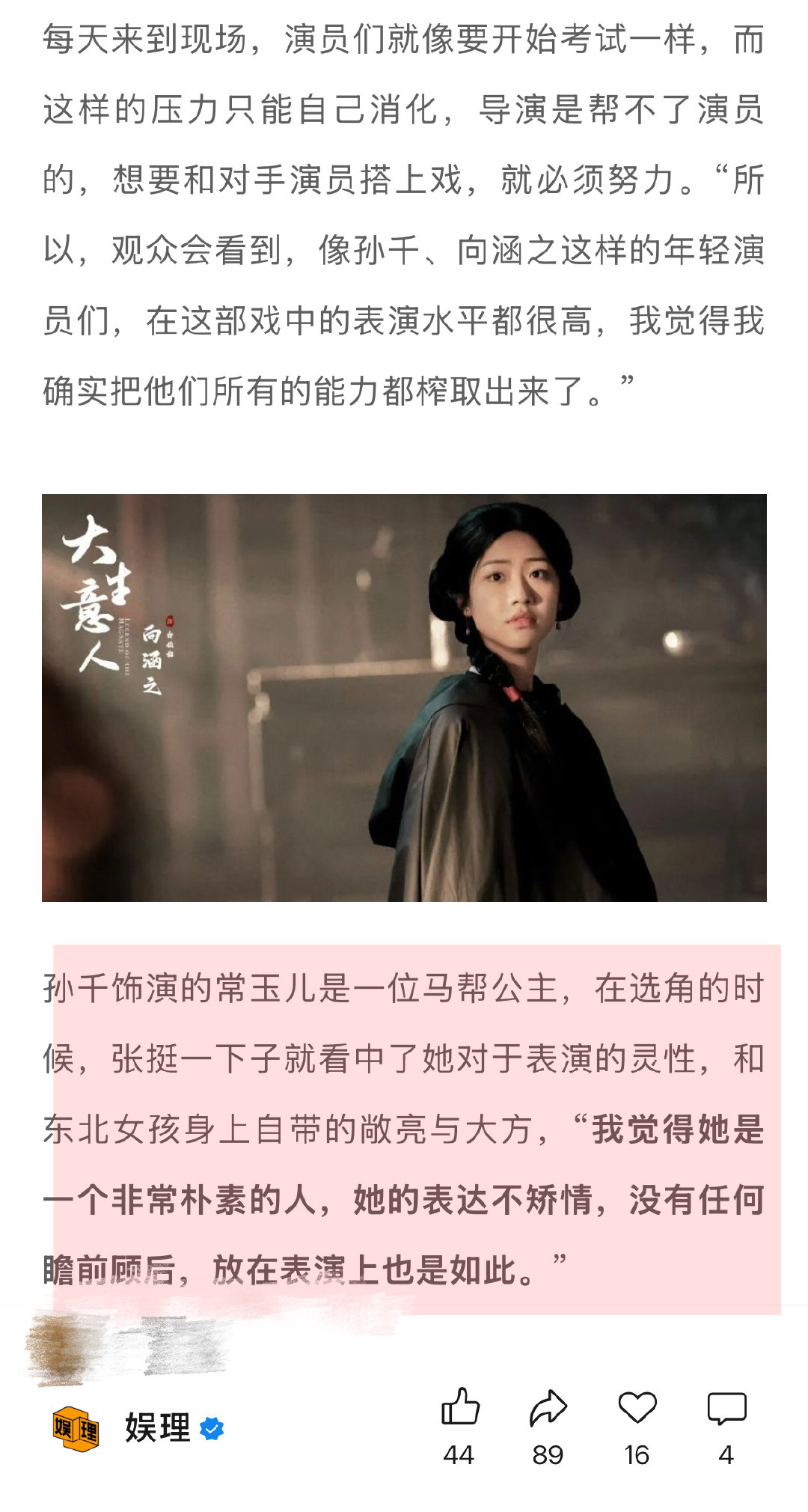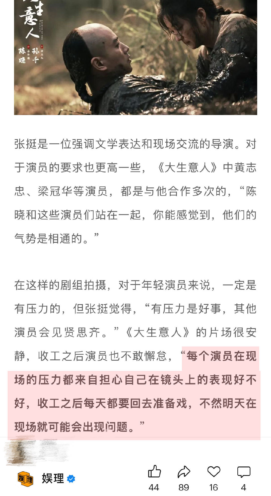导演在陈晓孙千身上找到了真诚 大生意人导演谈男女主角感情线 《大生意人》中的黄志忠、梁冠华等演员,都与张挺合作多次,“陈晓和这些演员们站在一起,你能感觉到,他们的气势是相通的。”在这样的剧组拍摄,对于年轻演员来说,一定是有压力的,但张挺觉得,“有压力是好事,其他演员会见贤思齐。”娱理独家↓