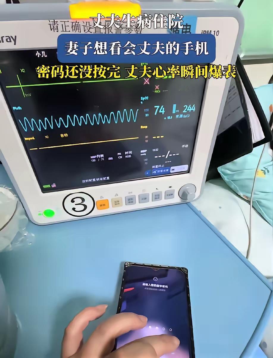 江苏一丈夫生病住院,妻子想看会丈夫的手机,丈夫这边说能看,随便,然后一个字一个字报密码。结果密码还没按完,丈夫心率瞬间爆表,直接从83飙升到244,血氧饱和度从96直接掉到74,整得心电监护仪直接报警了。 网友评论: 我的手机密码孩子都知道,我和我老公从来没有习惯看对方的手机,也没必要,夫妻之间要彼此信任尊重对方,每个人都有自己的隐私。 我和我老婆的是一样的,她还知道我支付密码,有次她拿我手机给自己发红包,发现删不了,除非清空聊天记录,就和我说刚拿你手机试发个红包玩玩。 看那血压飙升程度,就知道说可以看是不是口是心非了,心率说涨就涨,这手机里藏没藏秘密明人眼里早就知道了。 夫妻之间的手机为什么不能互看?为什么要互看?没有了信任在一起生活会有幸福吗?