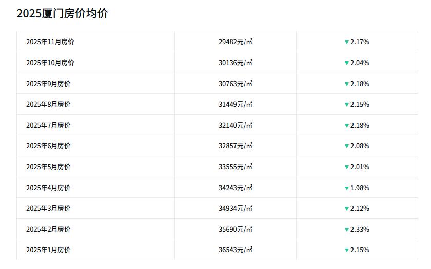 2015年11月,厦门房价均价25967元; 2016年11月,厦门房价均价38235元; 2017年11月,厦门房价均价47849元; 2018年11月,厦门房价均价43663元; 2019年11月,厦门房价均价46310元; 2020年11月,厦门房价均价49086元; 2021年11月,厦门房价均价50714元; 2022年11月,厦门房价均价52196元; 2023年11月,厦门房价均价48907元; 2024年11月,厦门房价均价38114元; 2025年11月,厦门房价均价29482元。 回顾厦门十年的房价,发现不仅仅是一串冰冷的数据,更是无数家庭资产变化的缩影。 数据的起点从2015年开始,到2025年,十年的数据形成了一条倒U型的曲线,这条曲线所映射的房产市场,相信也深深的映在厦门人民的心里。 对于厦门这座素有“海上花园”之称、土地资源稀缺的城市而言,一定是资本最青睐的地方。 那几年,厦门土拍市场地王频出,每块新地的楼面价都直逼甚至超过周边在售房价。这种面粉贵过面包的预期,彻底点燃了厦门购房人群的情绪。本地居民的改善需求集中释放,全国各地的投资客更是看好厦门的环境和发展潜力,携巨资涌入。厦门的房产,一时间成了硬通货。从25967元到47849元,只用了短短24个月,年均涨幅超过35%。 通过近三年的数据可以看出,房主不炒的政策已经初见成效,未来的厦门楼市,可能会进入一个L型的底部震荡阶段,普涨行情难再现,但核心区的优质资产依然能保值,对于厦门未来房地产市场的发展,希望大家可以在评论区进行交流。