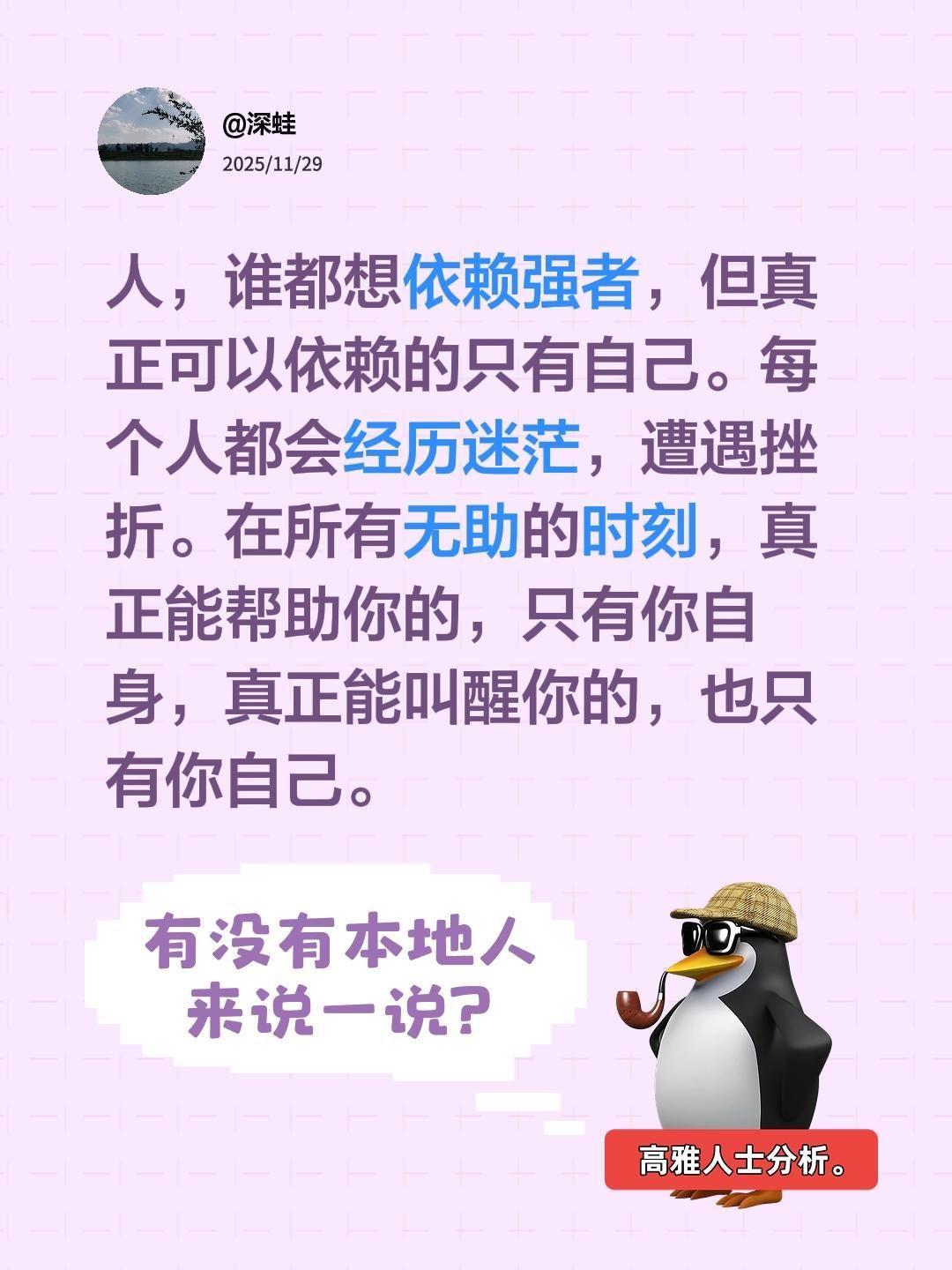 人,谁都想依赖强者,但真正可以依赖的只有自己。每个人都会经历迷茫,遭遇挫折。在所有无助的时刻,真正能帮助你的,只有你自身,真正能叫醒你的,也只有你自己。