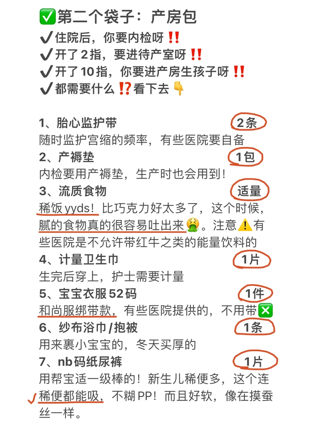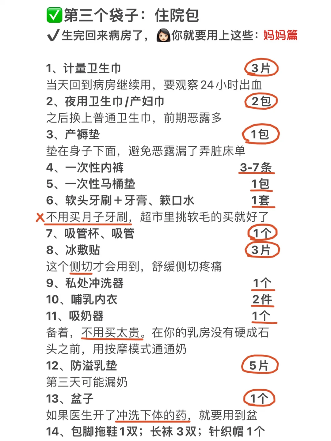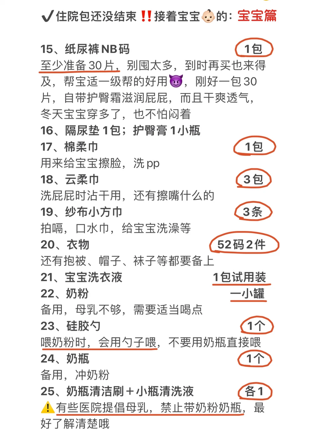 👩🏻顺产妈妈一般就住院3天,新生儿每天的纸尿裤用量约10片,去医院如果不想大包小包的,直接带一些小包装的纸尿裤。像帮宝适一级帮的迷你装,里面有30片,进产房带着方便又卫生;而且试用一下,觉得好用再买正装也避免浪费。如果你是剖腹产,则再多带20片。