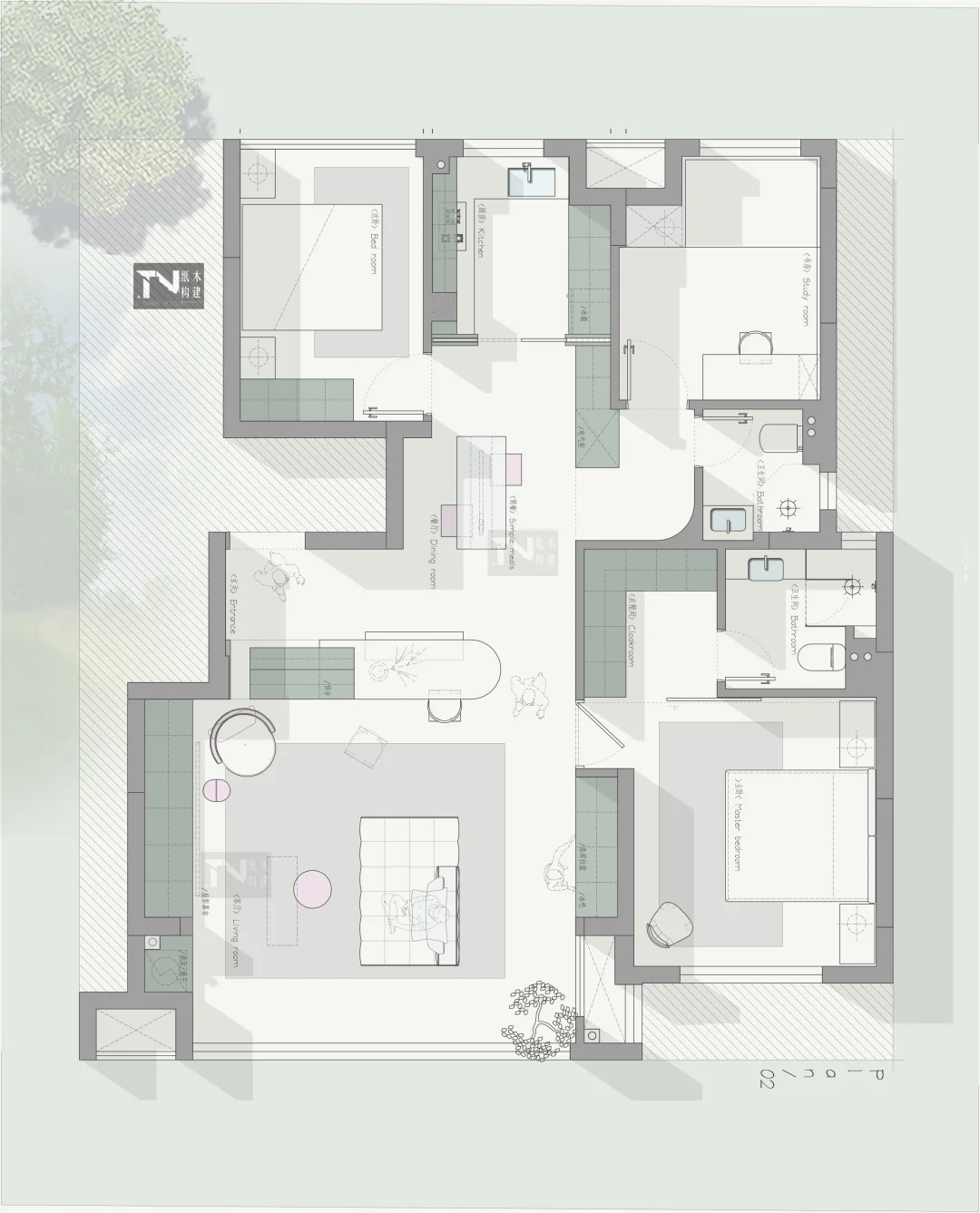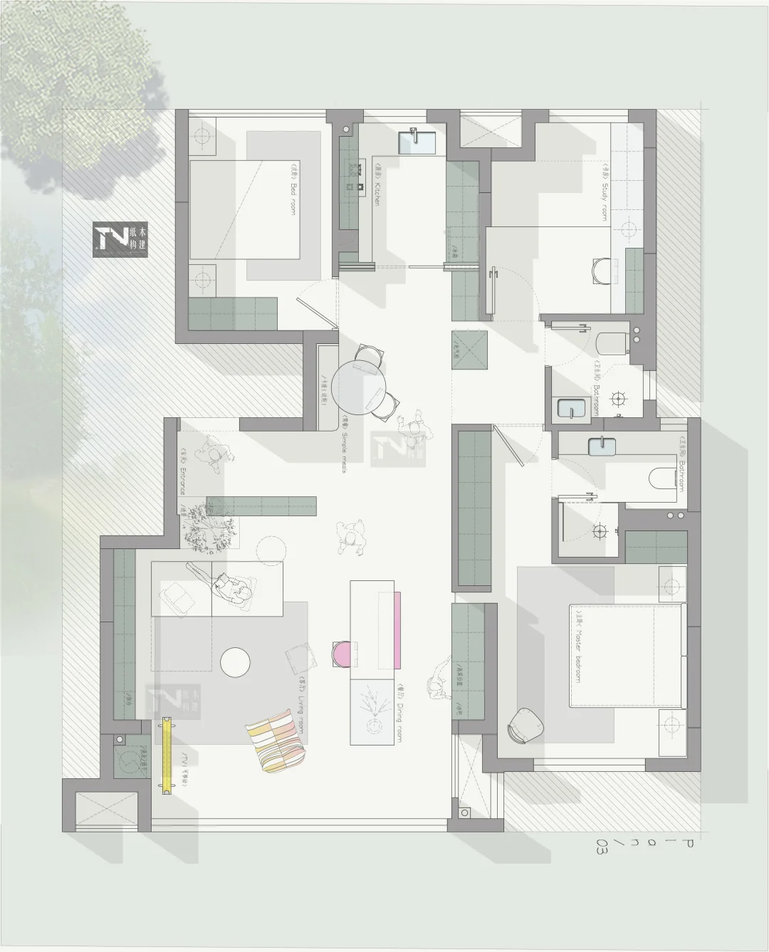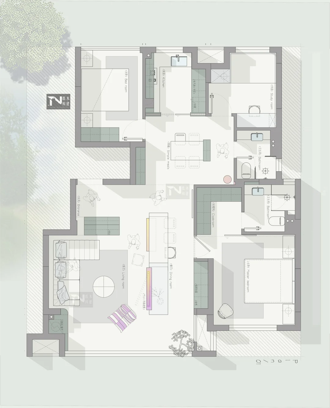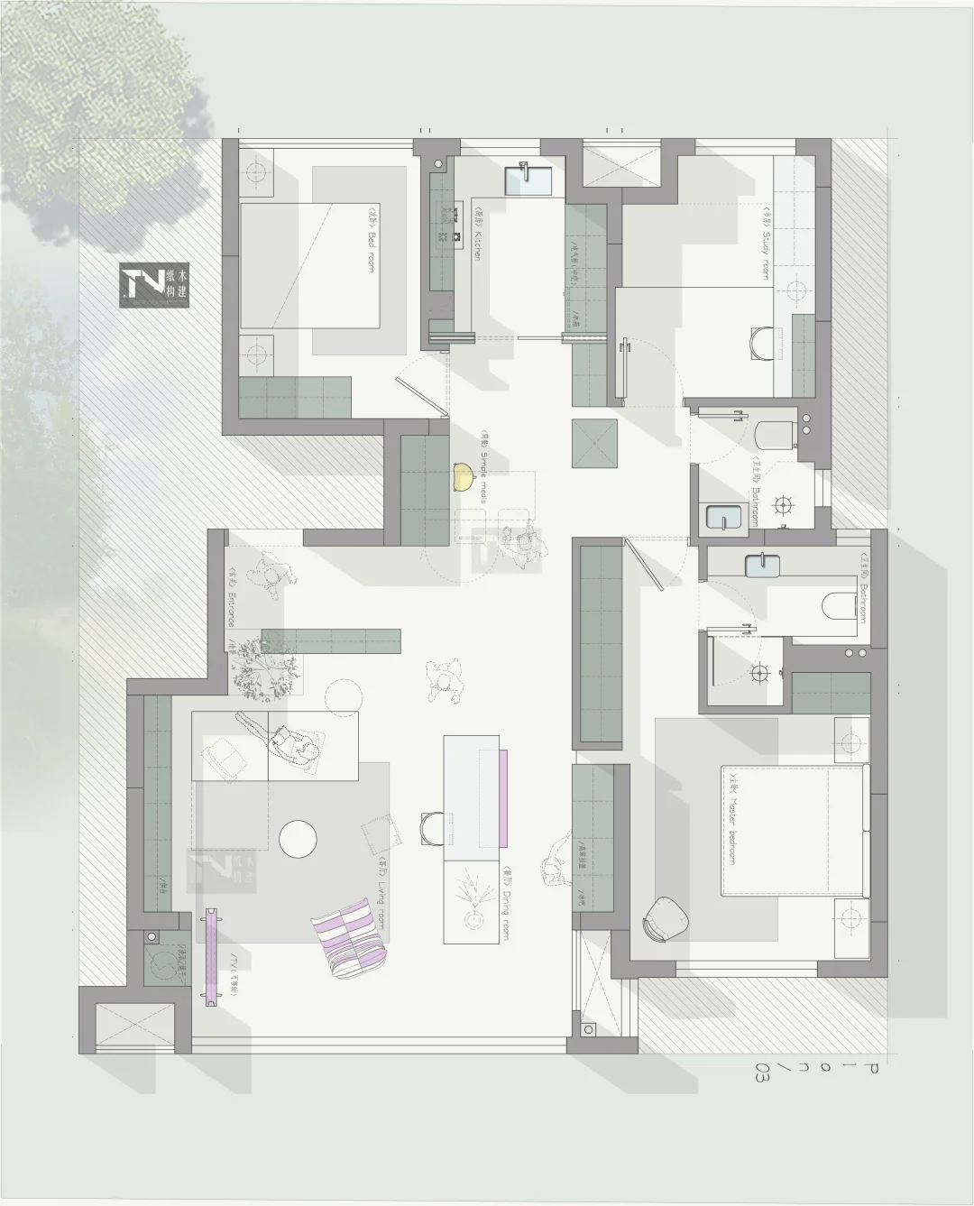 四版方案,送给你 设计需求: 1,一人居住,未来的一家三口 2,三个卧室,一个主卧,一个次卧,一个榻榻米式书房 3,餐桌想挪到客厅,做岛台餐桌(聚餐用),日常一人吃饭简餐。 4,客厅要通透,开阔 5,进门背景要半高柜(可收纳供台) 6,上下洗衣烘干机预留位置