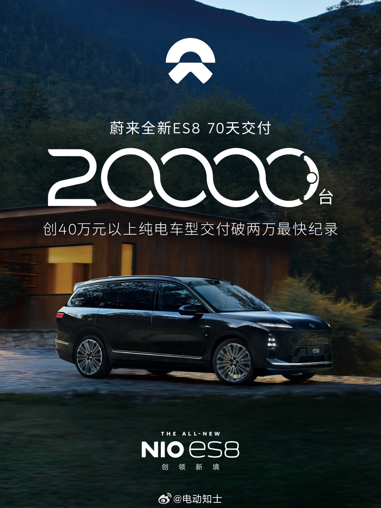 70天,全新蔚来ES8完成第20000台新车交付,这也是40万以上纯电...