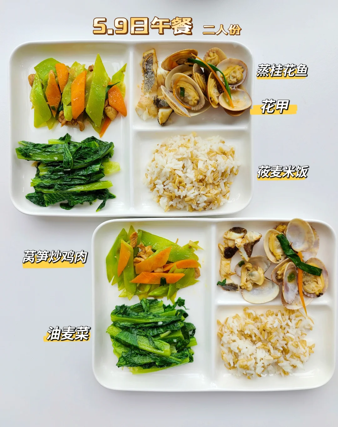 图片上两份餐食的是墨墨和妈妈每人一份,为了激励墨墨顺利减肥,妈妈和他一起减肥,一起分餐吃饭,一起做快乐的减肥搭子。