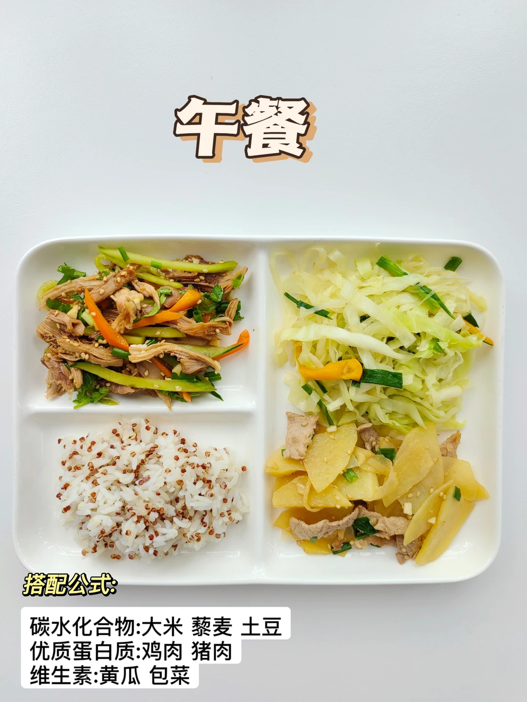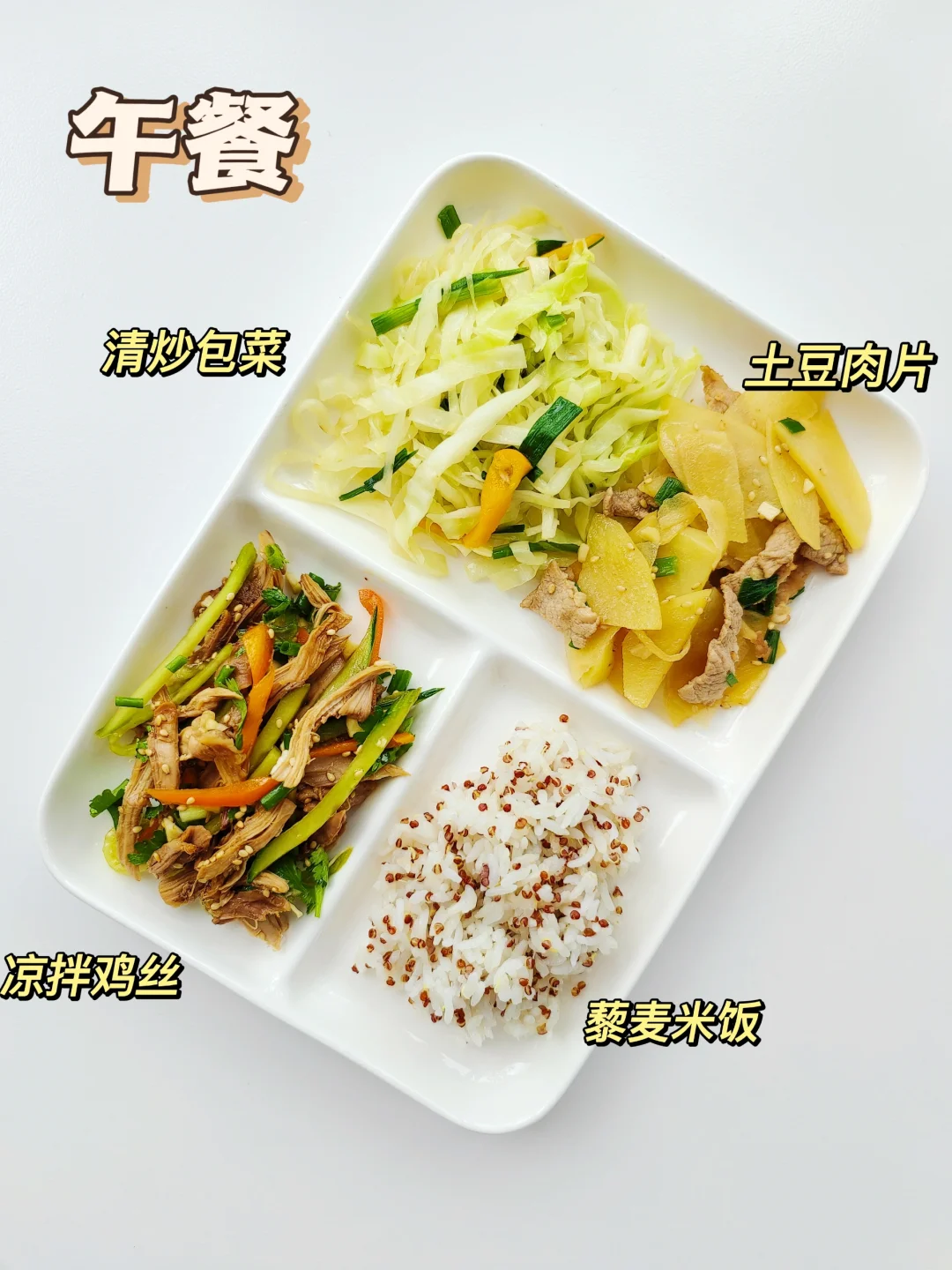 午餐:藜麦米饭➕凉拌鸡丝➕土豆肉片➕清炒包菜