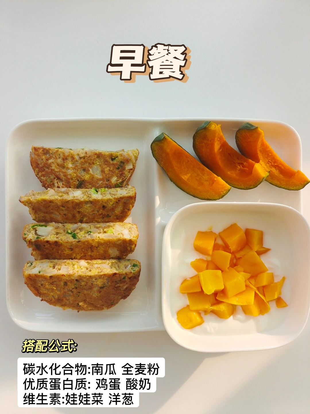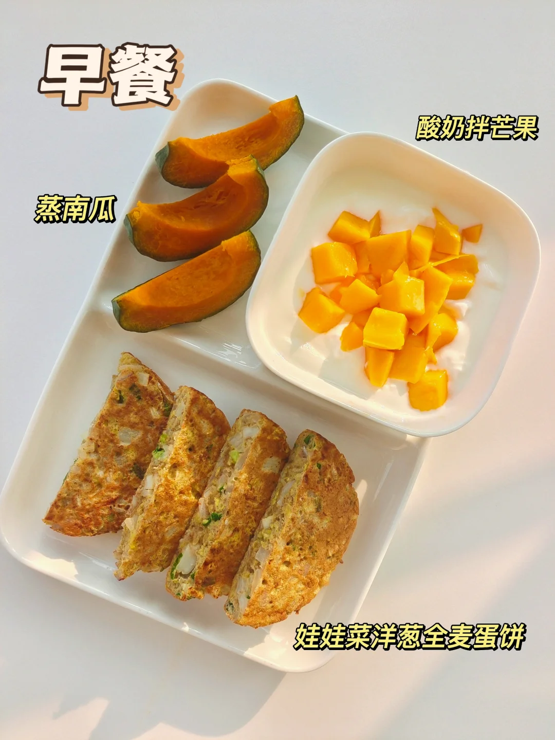 早餐:娃娃菜洋葱全麦蛋饼➕芒果拌酸奶➕蒸南瓜