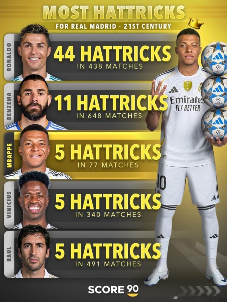 断档领先!本世纪皇马戴帽次数榜:C罗44次居首,本泽马11次、姆巴佩5次c罗姆巴佩