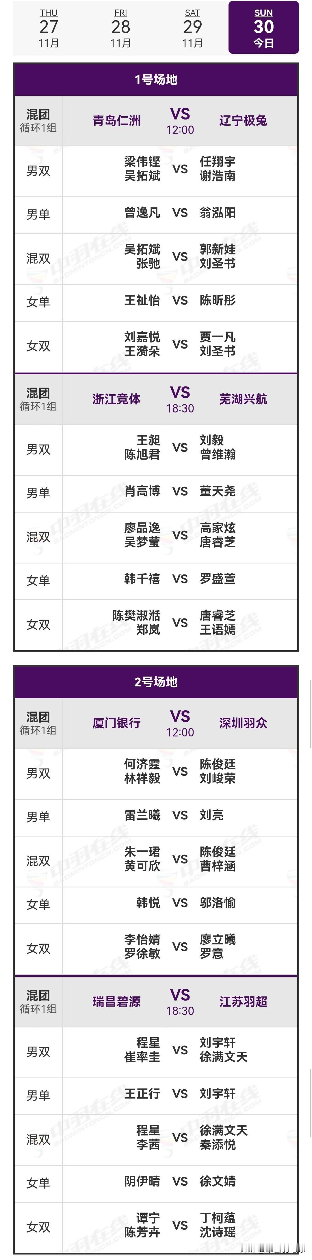 11月30日中国羽毛球俱乐部超级联赛安排 今天继续进行混团循环赛,白天场12:00开始,青岛仁洲vs辽宁极兔,厦门银行vs深圳羽众,晚场18:30开始,浙江竞体vs芜湖兴航,瑞昌碧源vs江苏羽超,详细对阵名单如下: 羽毛球赛事 羽毛球 羽毛球爱好者 羽毛球比赛 羽毛球赛程 国羽 国羽加油 中国羽毛球俱乐部超级联赛