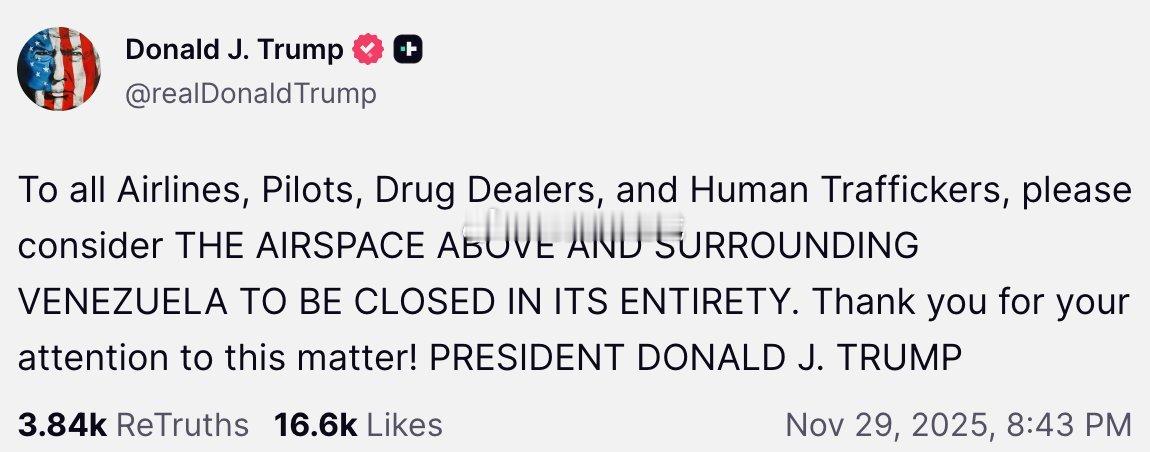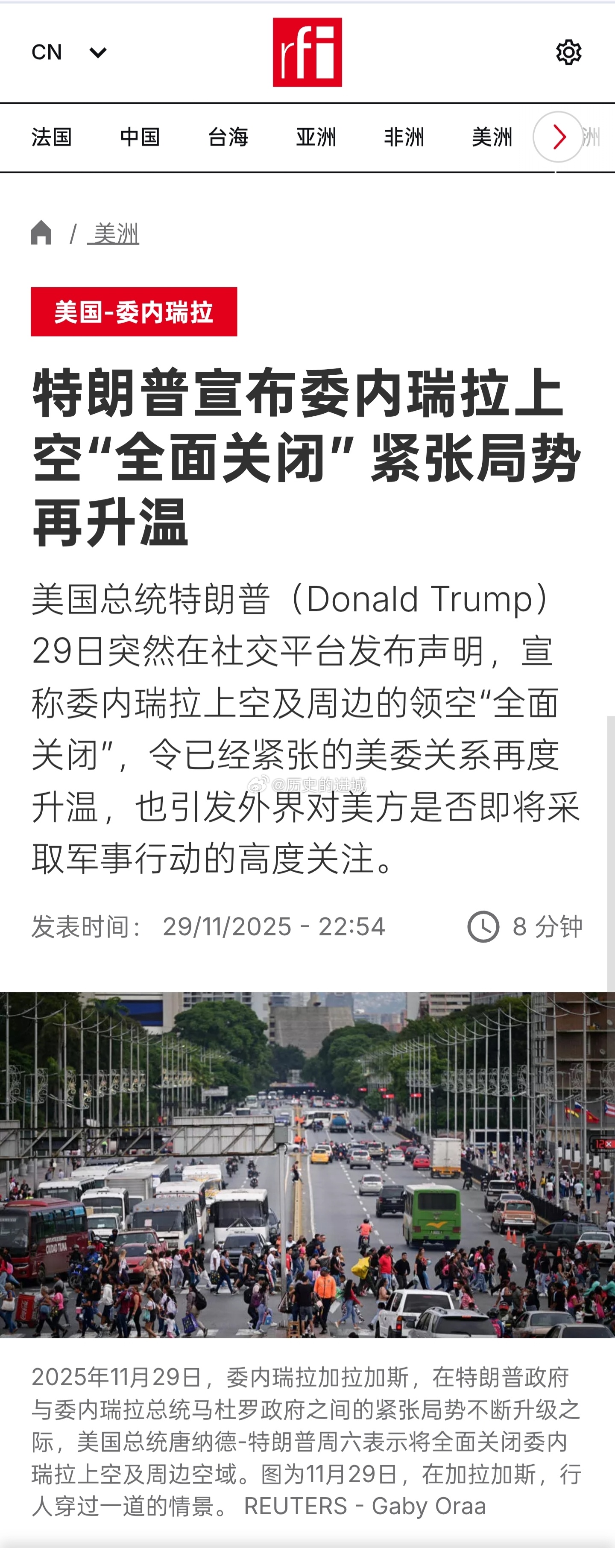 美国总统特朗普29日突然在社交平台发布声明,宣称委内瑞拉上空及周边的领空“全面关闭”,令已经紧张的美委关系再度升温,也引发外界对美方是否即将采取军事行动的高度关注。