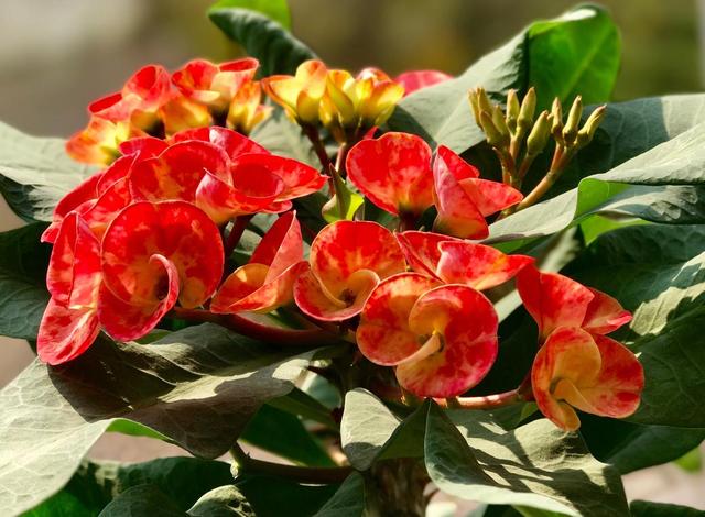 虎刺梅这种小花,开花虽然小小的,但是有红色有粉色,小小的精致鲜艳很耐看,它还特别皮实,开花时间长,至少可以一年开三个季节的花儿,花很多,株型不大,但是美观耐看,养在阳台上,就算不用遮阴也没有关系,会长得很好。