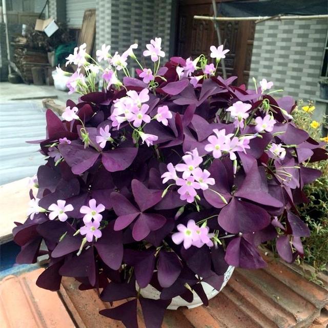 这种花儿最顽强皮实了,它长出来的叶子是紫颜色的,非常纯正的紫色,紫红色的样子,就像是一个个的紫色蝴蝶,形状也是很好看的,光看叶子已经够满足了,还会开出淡紫色的小花儿来。