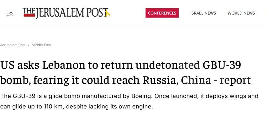 今年最抽象新闻?美国要求黎巴嫩归还未引爆的GBU-39炸弹 简单来说就是以色列用美国的炸弹炸黎巴嫩,然后有些炸弹没引爆,然后现在美国要求黎巴嫩归还,因为怕老中跟毛子得到