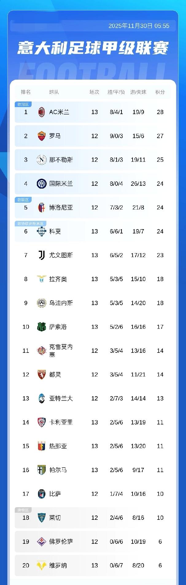 意甲积分榜:米兰先赛积28分暂登顶,尤文积23分第七!罗马将战那不勒斯 11月30日 意甲第13轮 AC米兰1-0战胜拉齐奥 尤文2-1击败卡利亚里 积分榜上:米兰先赛积28分暂以1分优势领跑。尤文积23分第七!本轮罗马未赛将战那不勒斯,国米将战比萨。