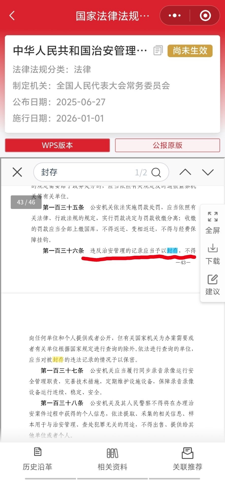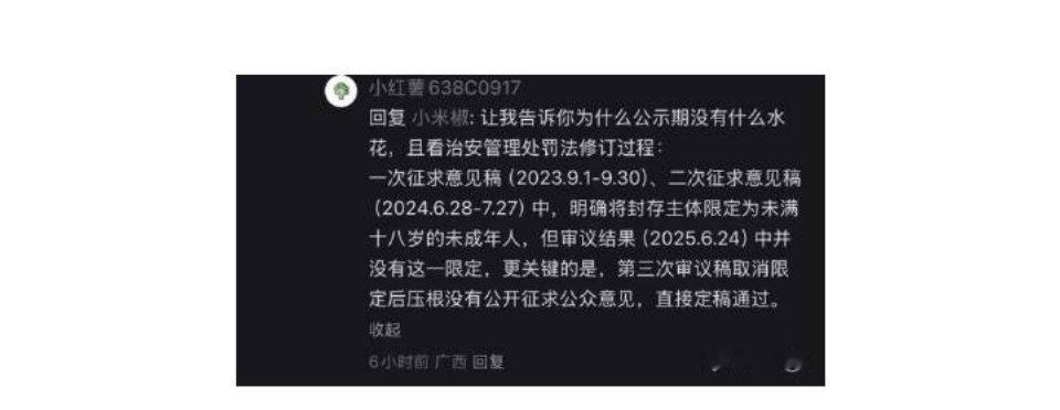我去核实了,确实是这样。2023年修订治安管理处罚法的草案说明还明确说了“增加对未成年人违反治安管理记录的封存规定”,怎么到最后去掉了未成年人,变成了所有人的?中间没有任何关于修改这一条的过程说明,也没看到征求意见。有没有人偷梁换柱,程序是不是合法合规?事实证明,老百姓说几句牢骚话改变不了什么,但某些有特殊目的的“砖家”说几句会严重影响我国的历史进程,希望严查