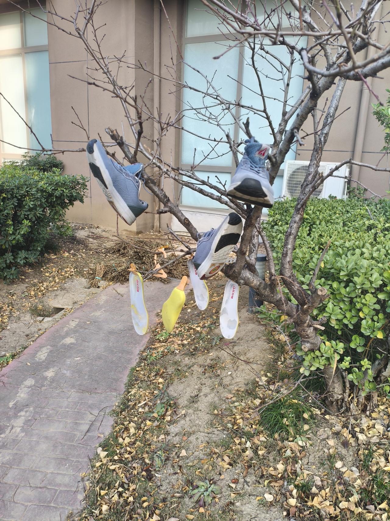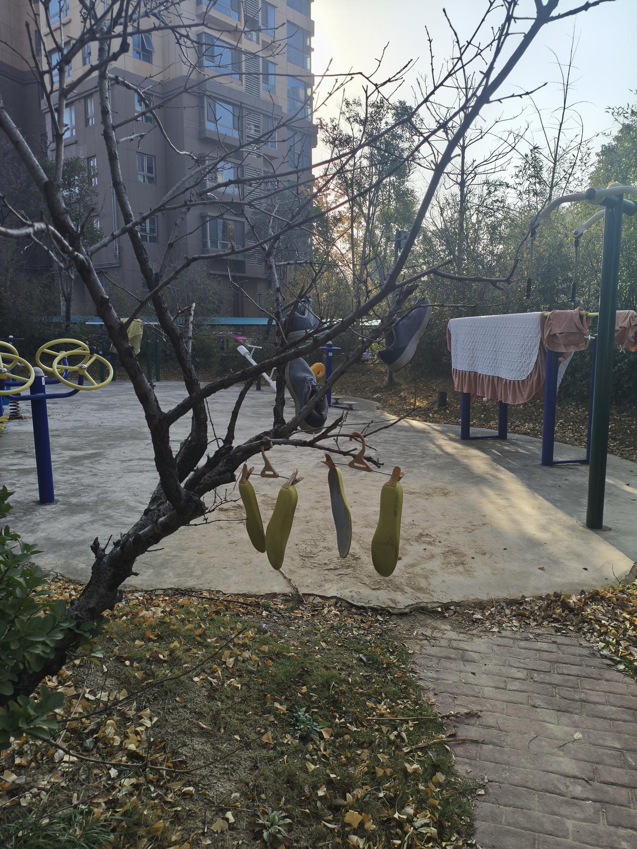 小区树上晒衣服,健身器材上晒被子,你们小区有吗?其实晒晒太阳更健康!为什么鞋子挂在树上晒不懂?有什么讲究公园晒太阳 小区院里晒太阳