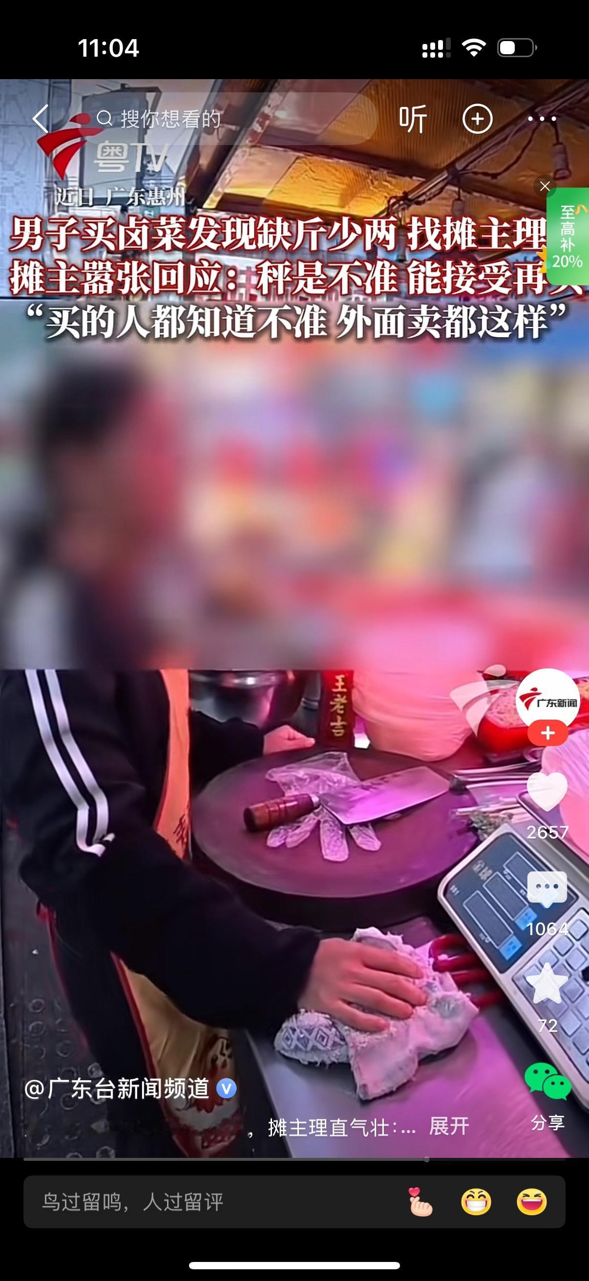 男子买卤菜发现少称了。他去找店家理论。店家理直气壮,是不准啊。男子很生气,不准你还卖?店主说,地球人都知道不准。你不懂?男子说这个24块钱,我不要了,你给我退了。店家很嚣张,卖出去了概不退货。你买之前就要想清楚。男子被这种无良商家惹怒了,他一手掀翻这个摊子。店家指着男子说,我要报警。男子说,好啊,我也要报警。店家却迟迟没有报,他不敢。他只能眼睁睁地看着男子离去。这就是恶有恶报吧。