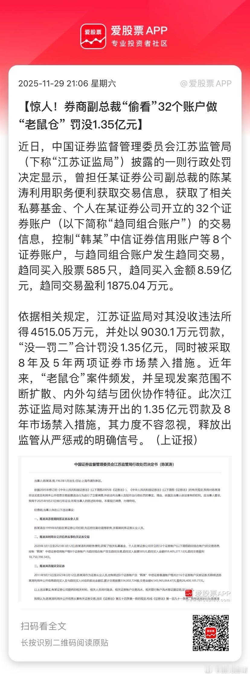 【惊人!券商副总裁“偷看”32个账户做“老鼠仓” 罚没1.35亿元】近日,中国证券监督管理委员会江苏监管局(下称“江苏证监局”)披露的一则行政处罚决定显示,曾担任某证券公司副总裁的陈某涛利用职务便利获取交易信息,获取了相关私募基金、个人在某证券公司开立的32个证券账户(以下简称“趋同组合账户”)的交易信息,控制“韩某”中信证券信用账户等8个证券账户,与趋同组合账户发... 网页链接有这种人 能好的了?