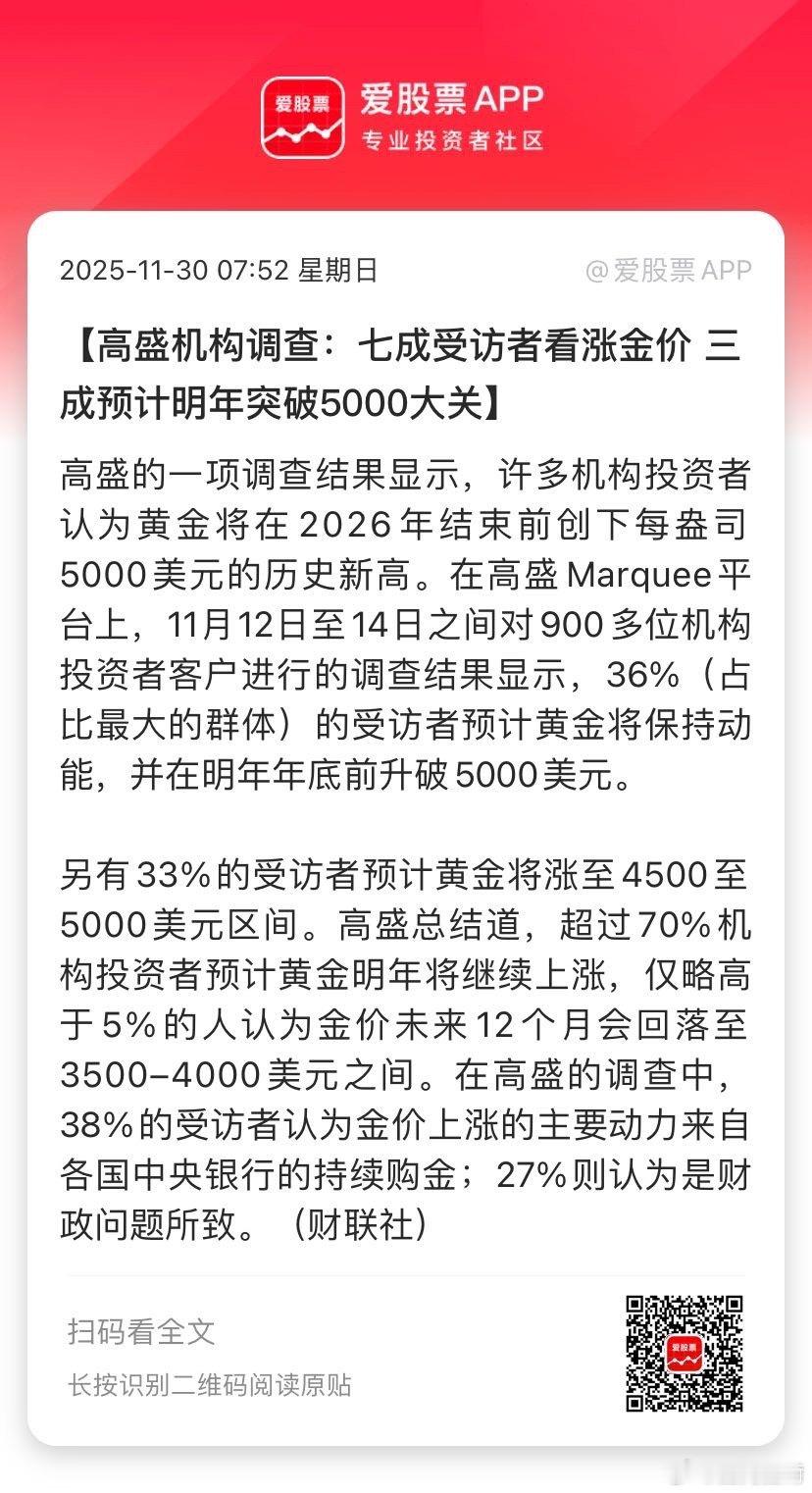 【高盛机构调查:七成受访者看涨金价 三成预计明年突破5000大关】高盛的一项调查结果显示,许多机构投资者认为黄金将在2026年结束前创下每盎司5000美元的历史新高。在高盛Marquee平台上,11月12日至14日之间对900多位机构投资者客户进行的调查结果显示,36%(占比最大的群体)的受访者预计黄金将保持动能,并在明年年底前升破5000美元。 另有33%... 网页链接