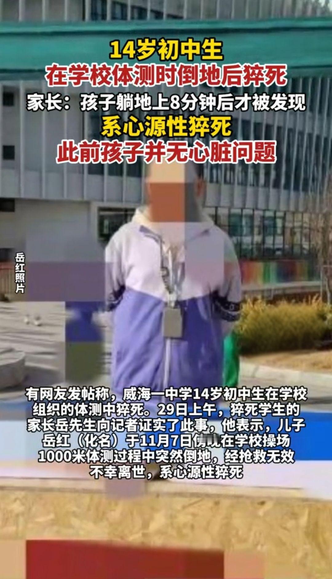 11月29日报道,山东威海,14岁初中生学校体测倒地后猝死 ,家长: 孩子此前并无心脏问题,躺在地上数分钟未被发现。