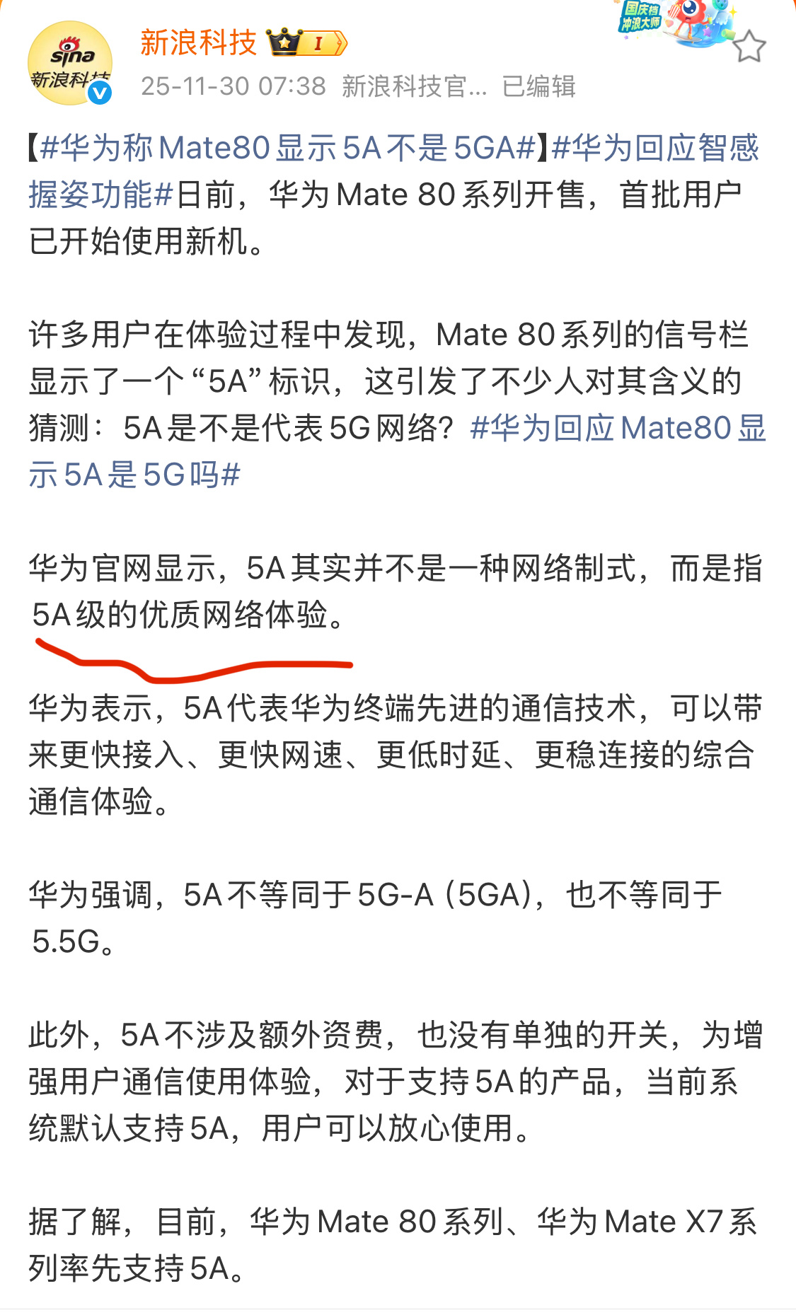 华为称Mate80显示5A不是5GA原来是代表5A级的优质网络体验,这种表述业内