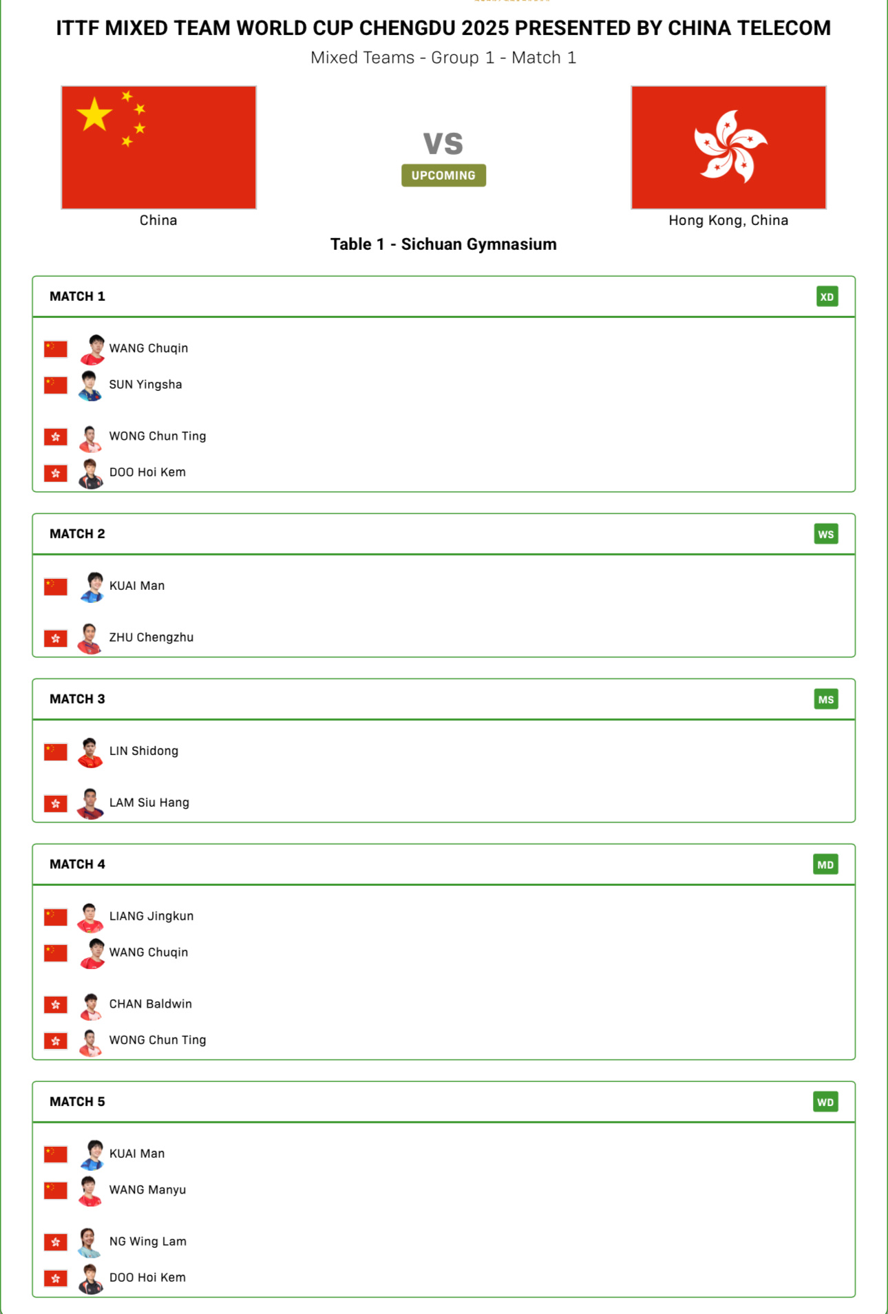 2025成都混合团体世界杯中国🇨🇳vs中国香港🇭🇰混双:王楚钦/孙颖莎vs黄镇廷/杜凯琹女单:蒯曼vs朱成竹男单:林诗栋vs林兆恒男双:梁靖崑/王楚钦vs陈颢桦/黄镇廷女双:蒯曼/王曼昱vs吴咏琳/杜凯琹