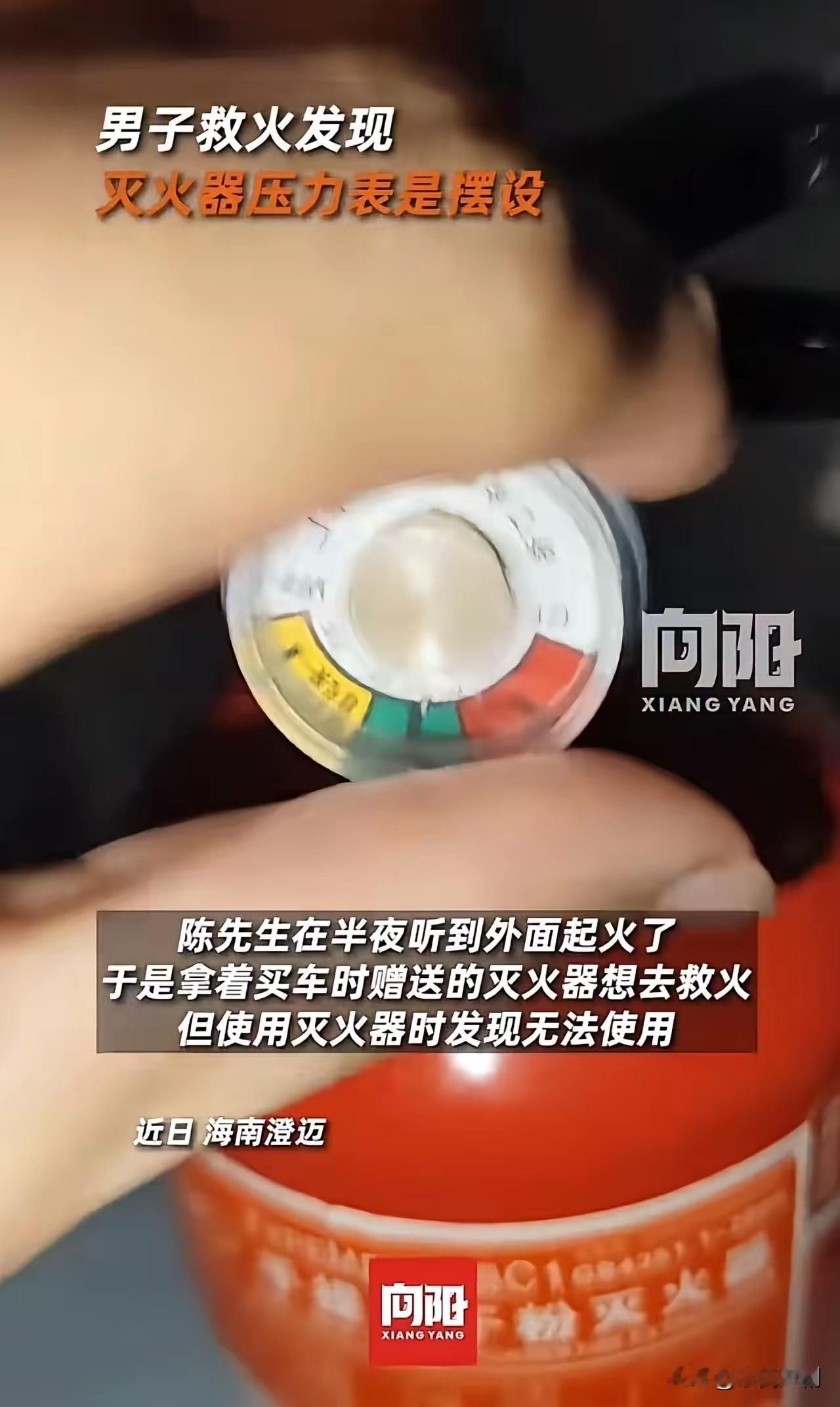 在当今社会,诚信与责任理应是每个人坚守的底线。然而,令人痛心疾首的是,仍有部分人利欲熏心,为谋取私利不择手段,制造假冒伪劣产品,严重危及公众生命安全。近日,一则海南男子在危急时刻发现灭火器形同“摆设”的新闻,引发了社会的广泛关注与深刻反思。 事件发生在海南的一个夜晚,男子突然听到外面传来火光的动静,敏锐意识到可能发生了火灾。他迅速拿起自己车内的灭火器,火速奔赴现场准备灭火。然而,令人惊愕的是,打开灭火器后,压力表竟毫无指示,喷嘴也喷不出任何灭火剂。经仔细检查,男子才发现这个灭火器的压力表只是个摆设,根本不具备灭火功能。这一幕着实令人愤怒又失望。 这起事件折射出一个令人忧心的问题:在一些地区,假冒伪劣产品泛滥成灾。灭火器作为保障生命安全的关键装备,其质量和可靠性直接影响应急救援成效。遗憾的是,部分不良商家为追求短期利益,大肆制造“假货”,甚至用劣质材料滥竽充数,严重威胁公共安全。 网友们纷纷表达愤慨与担忧。有人直言:“灭火器都敢造假,简直丧尽天良!”也有人感叹:“有些国人真是没了底线,这种关乎生命的东西都能造假。”这既反映出社会对诚信缺失的忧虑,也呼吁相关部门加强监管,严厉打击制假售假行为。 事实上,造假不仅是商业道德的沦丧,更是对生命安全的漠视。每一件假冒伪劣产品都可能在关键时刻酿成无法挽回的悲剧。为了自身和他人的安全,我们应提高警惕,选择正规渠道购买消防设备,切勿因贪图便宜而埋下巨大隐患。 同时,相关部门要强化监管力度,加大对制假售假行为的打击力度。公众也应增强安全意识,学习基本的应急知识,遇到类似情况时能及时辨别真伪,避免陷入危险境地。 总之,诚信是社会的基石,安全是生命的保障。唯有齐心协力,坚决抵制假冒伪劣产品,才能营造一个更加安全、可靠的生活环境。每个人都应成为诚信的捍卫者,让“假货”无所遁形,让生命安全得到切实保障。