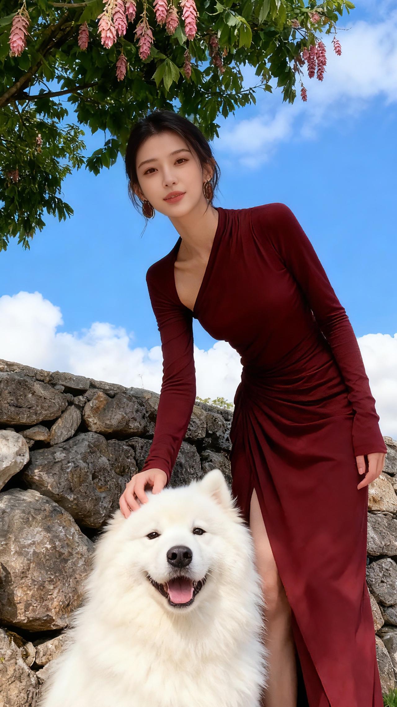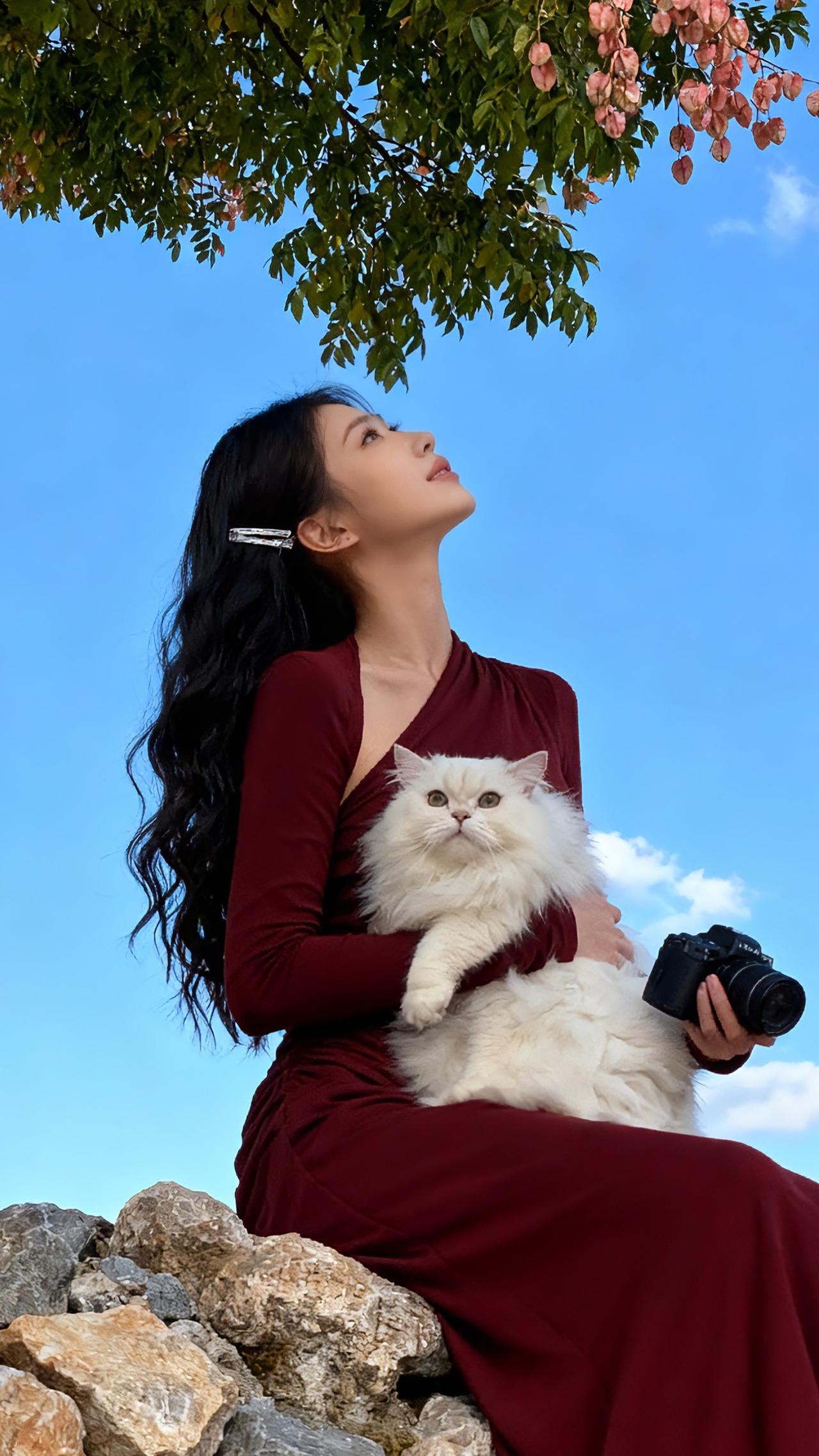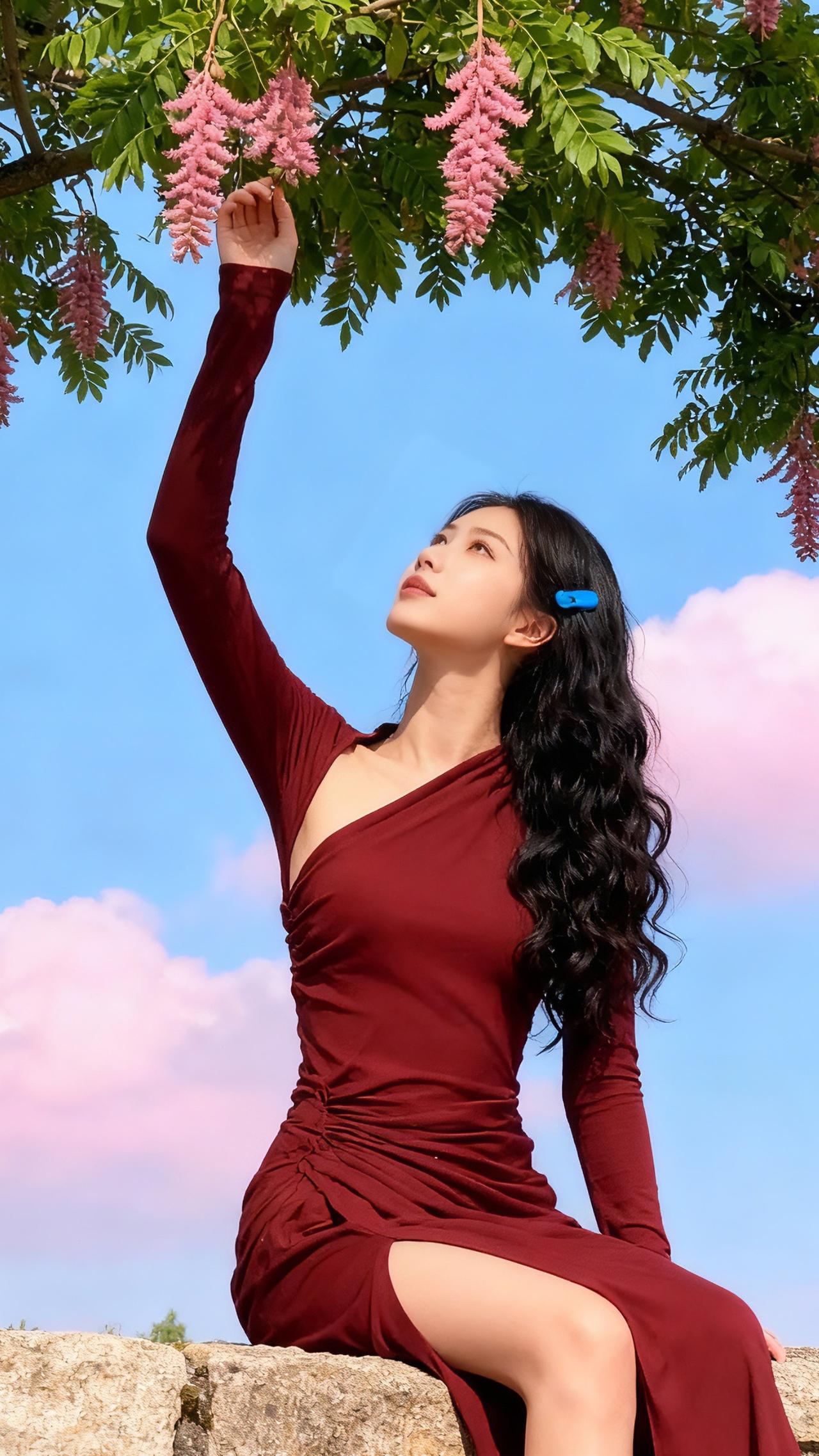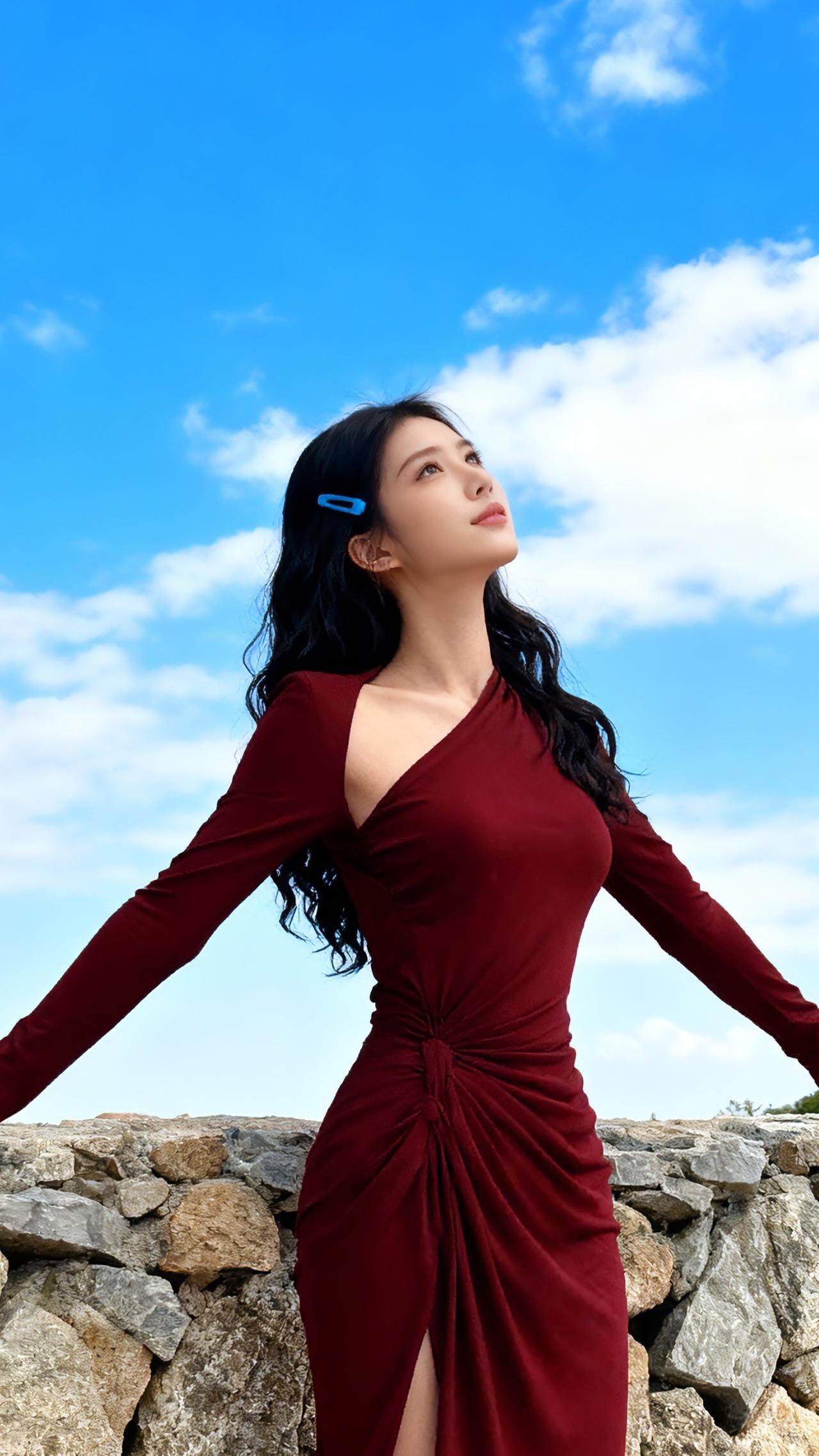 当暖光漫过裙身的褶皱,酒红色像被揉碎的日落,沿着斜肩的线条淌成一帧无声的电影。 单侧露肤是恰到好处的留白,高开衩藏着步履间的轻晃,连身后的水墨都成了它的注脚——原来一件裙子也能替你说尽,克制里的热烈,温柔里的锋芒。出游穿搭 日系小清新 外拍 女神永远是女神